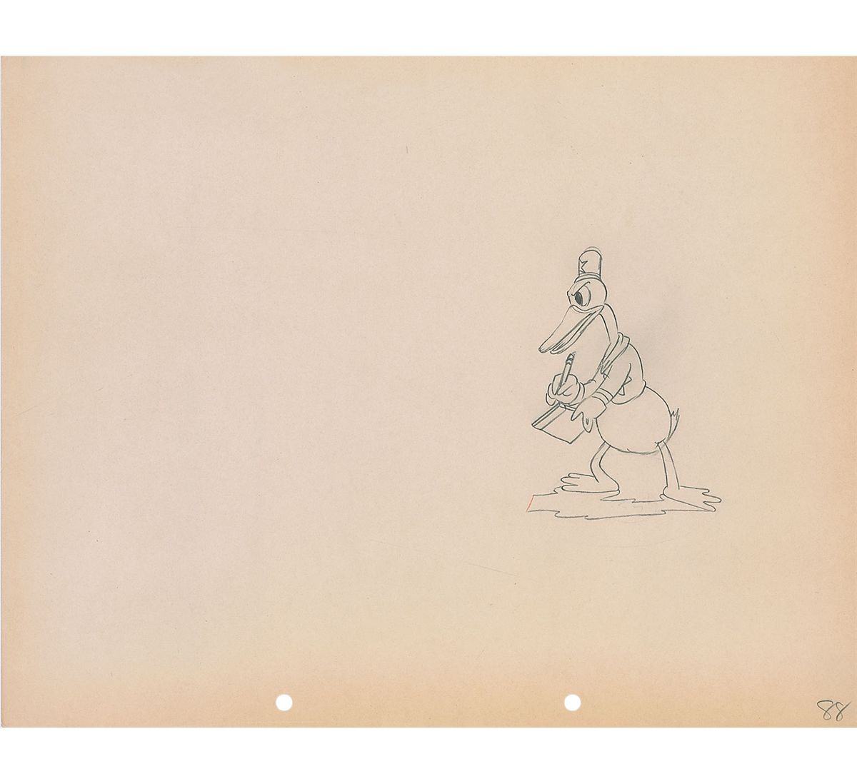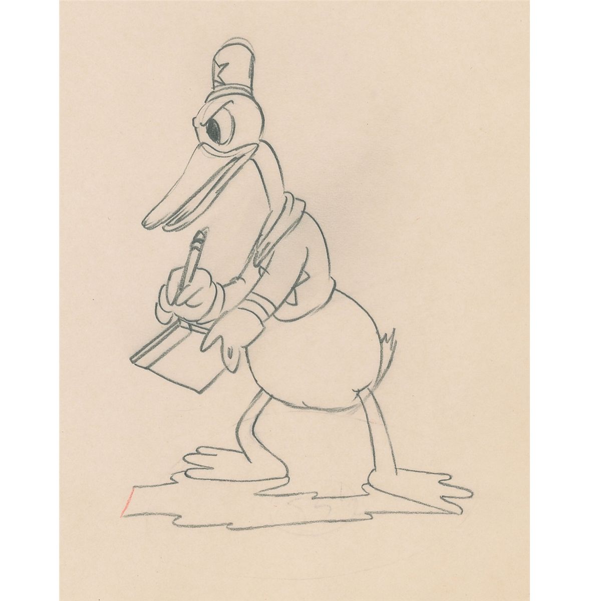 (Walt Disney Studios, 1934) Original production drawing featuring Donald Duck from The Dognapper. Accomplished in graphite on untrimmed 12 x 9.5 animation paper. Image measures 2.75 x 4 and shows a very early image of a long-billed Donald Duck, dressed in a policeman’s uniform, taking notes. In fine condition. This short was just the third appearance of Donald Duck, and the first story to feature both Mickey and Donald together.