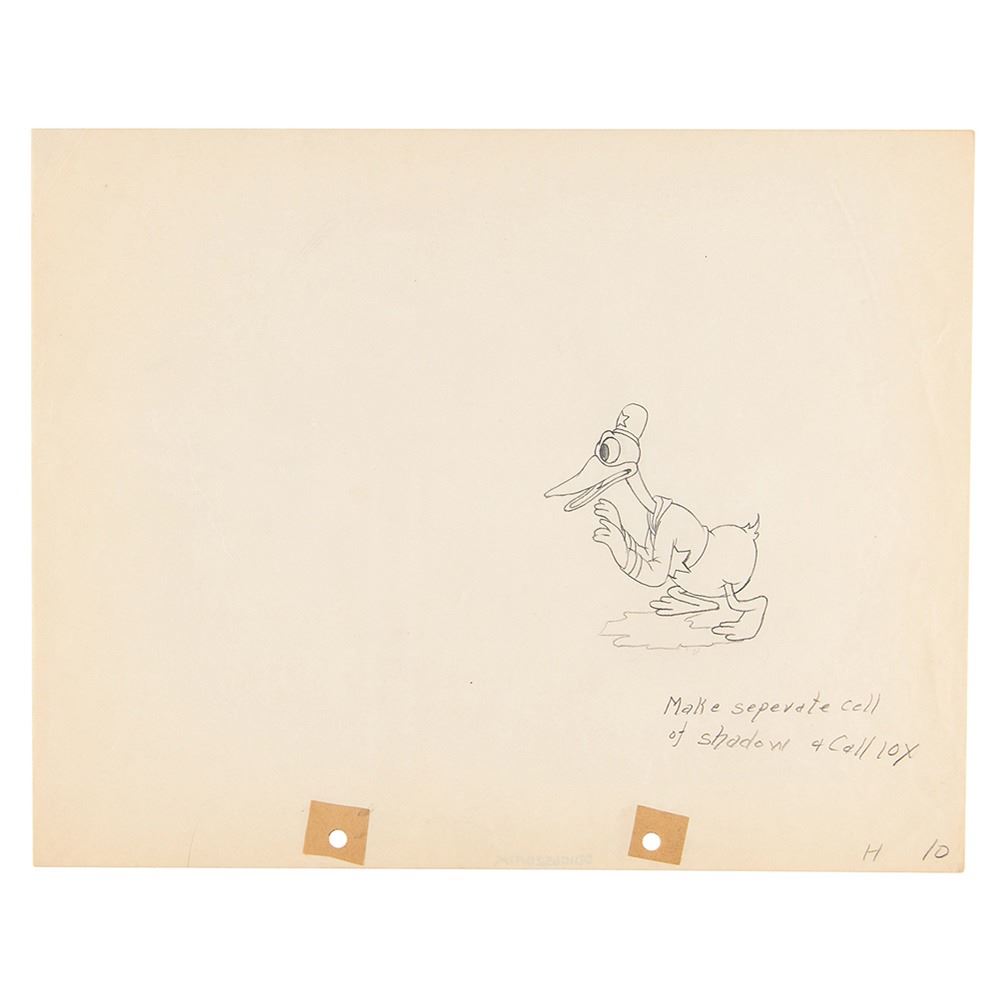 (Walt Disney Studios, 1934) Original production drawing featuring Donald Duck from The Dognapper, depicting Donald wearing his policeman uniform in a full-length profile pose. Accomplished in graphite on untrimmed 12 x 9.5 animation paper marked "H 10" in the lower right corner. Image measures 3 x 3. In fine condition, with trivial creasing. The Dognapper was Donald's third short and was the first adventure story to feature both Mickey and Donald.