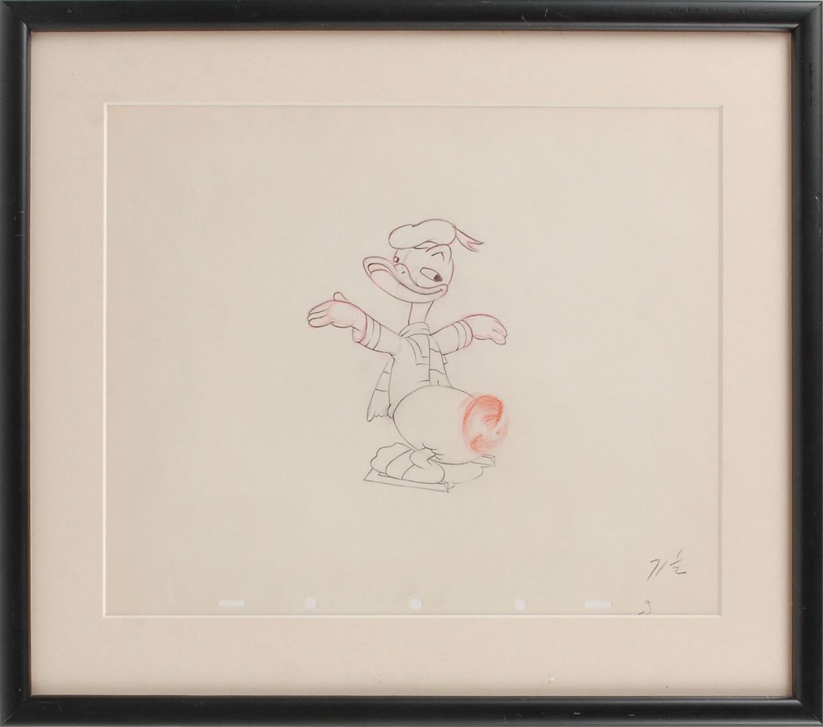 (Walt Disney Studios, 1939) Original production drawing featuring Donald Duck from the cartoon short The Hockey Champ, showing Donald wearing a scarf and ice skates, his arms outstretched, and his tail windmilling for takeoff. Accomplished in graphite and colored pencil on untrimmed animation paper. Image measures 3.75 x 5.25, with a mat opening of 11.75 x 9.75. This piece is also framed to an overall size of 15.75 x 14. In fine condition.