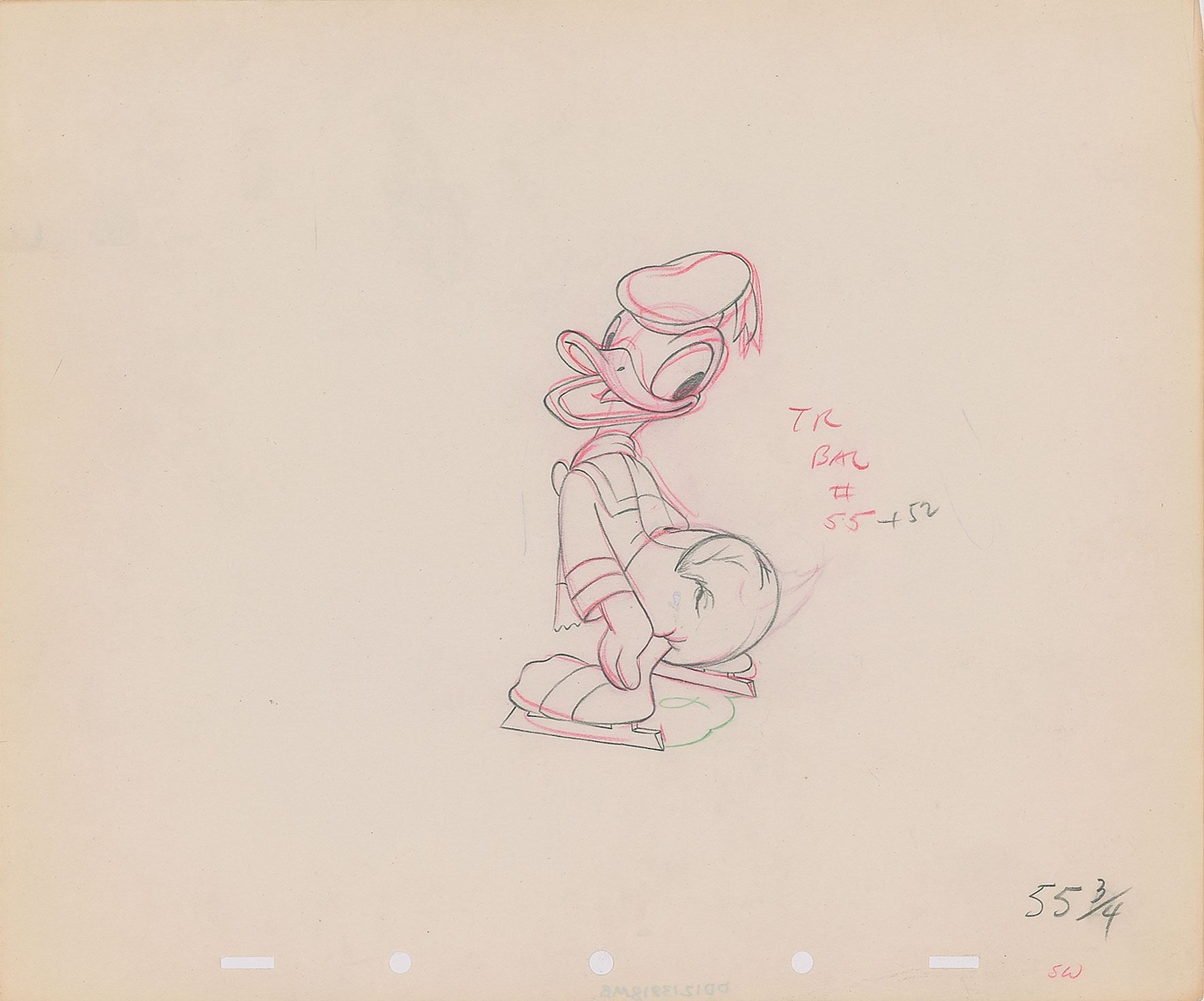 (Walt Disney Studios, 1939) Original production drawing featuring Donald Duck from The Hockey Champ, showing him on ice skates and using his tail as a propellor. Accomplished in graphite and colored pencil on untrimmed 12 x 10 animation paper, marked "55 3/4" in the lower right. Image measures 2.75 x 5. In fine condition. An appealing full-figured pose from a memorable Disney sports cartoon.