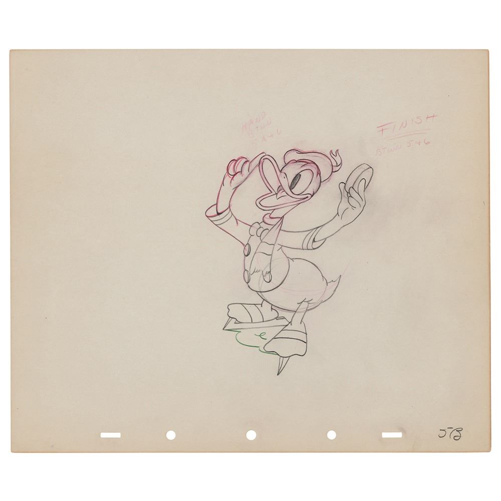 (Walt Disney Studios, 1939) Original production drawing featuring Donald Duck from The Hockey Champ, showing Donald wearing a scarf and ice skates while holding a hockey puck. Accomplished in graphite on untrimmed 12 x 10 animation paper, marked "5B in the lower corner. Image measures 4.25 x 5.75. In fine condition.