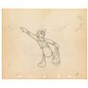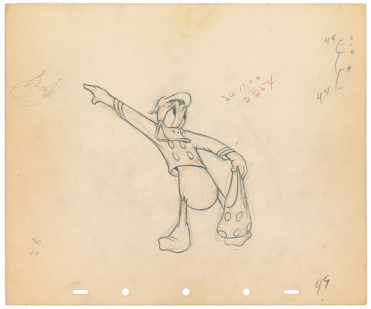 (Walt Disney Studios, 1941) Original production drawing featuring Donald Duck from Timber, portraying the mischievous duck as he prepares to shove some stolen food into his polka dot bindle. Accomplished in graphite and colored pencil on untrimmed 12 x 10 animation paper. Image measures 5.5 x 5.75. In fine condition.