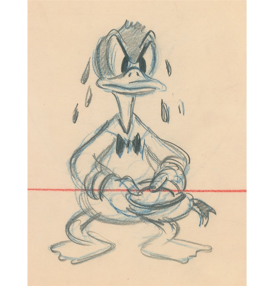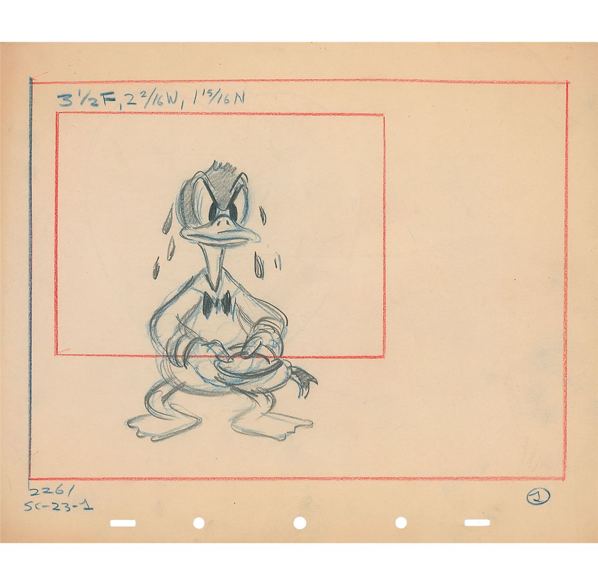 (Walt Disney Studios, 1941) Original production layout drawing featuring Donald Duck from A Good Time for a Dime. Accomplished in colored pencil and graphite on untrimmed 12 x 10 animation paper. Full-length image of a soaked Donald measures 4 x 5.5, with two red squares added during production. In fine condition.