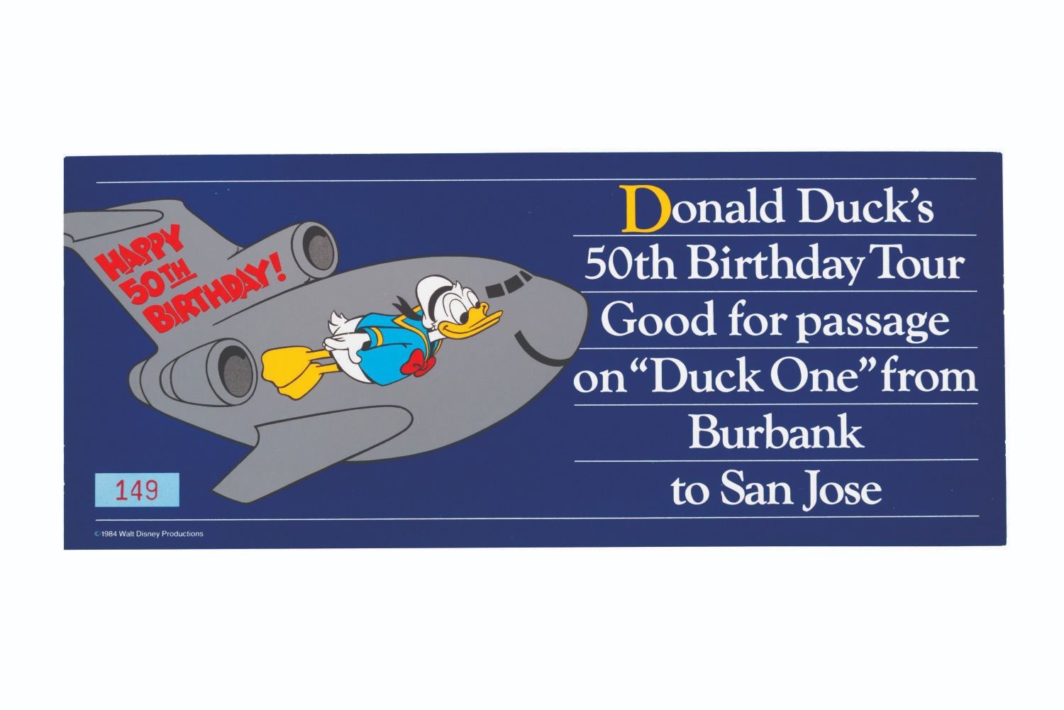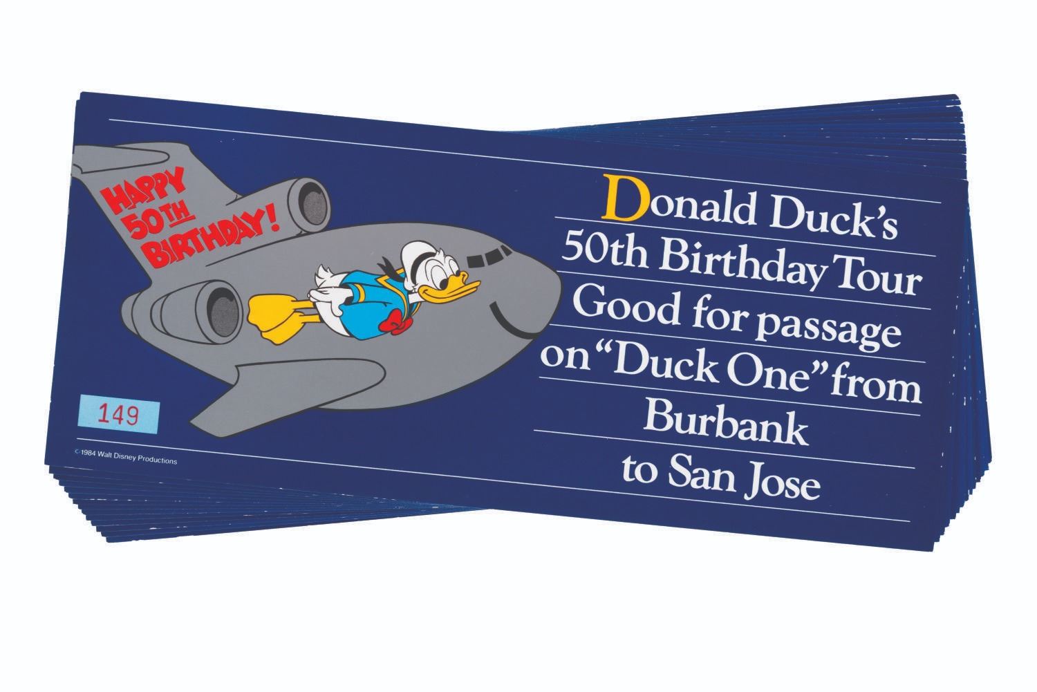 (Disney, 1984) A set of 14 Donald Duck's 50th Birthday Airline ticket vouchers. Featuring a colorful image of Donald Duck on the side of a large airplane, each voucher was good for one leg of 'Duck One’s' flight from Burbank across country to Chicago, New York City, Dallas, Orlando, and ten more cities, in celebration of Donald's birthday on November 13, 1984. Each measuring 3.5" x 8.5", the vouchers are in good condition with edge wear and surface scuffing from storage.