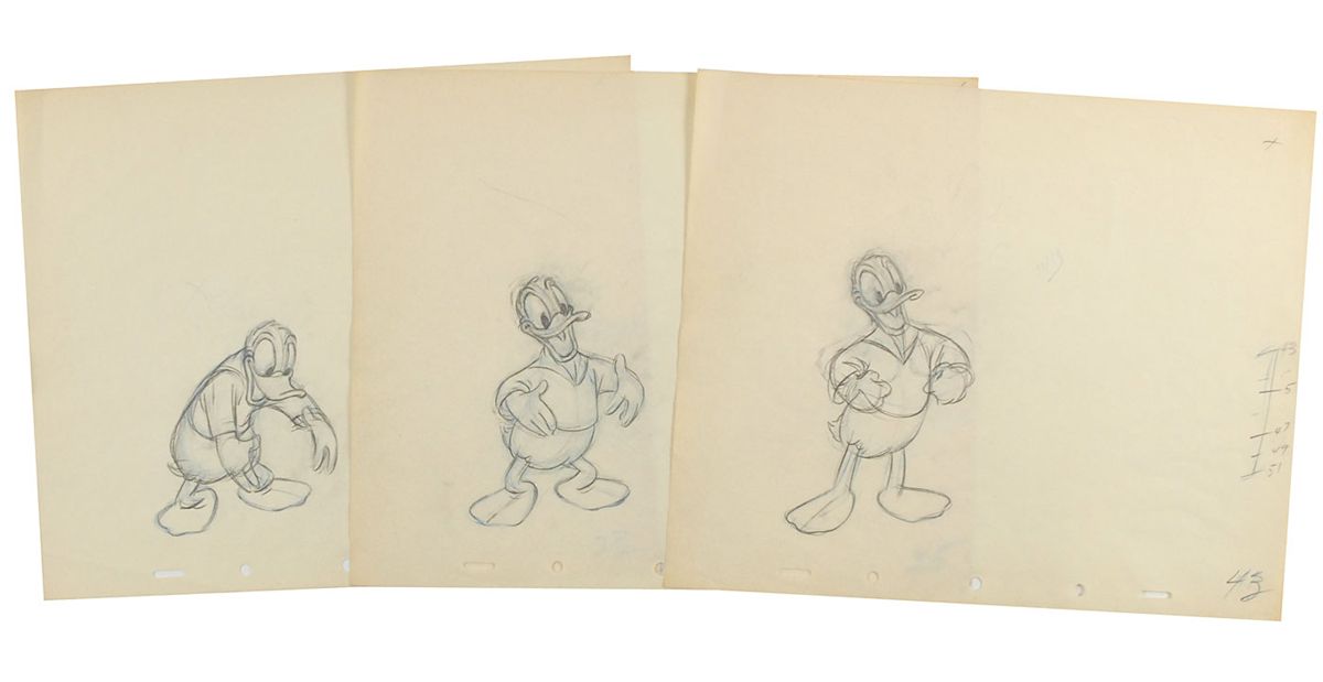 (Walt Disney Studios, Circa 1940s) Original set of three ‘rough’ production drawings in sequence featuring Donald Duck rising and stretching. Accomplished in graphite and colored pencil on three sheets of untrimmed 12 x 10 animation paper. Overall image sizes range from 4 x 4 to 3 x 5.5. In fine condition. A wonderful example of the process behind creating the illusion of movement in animation.
