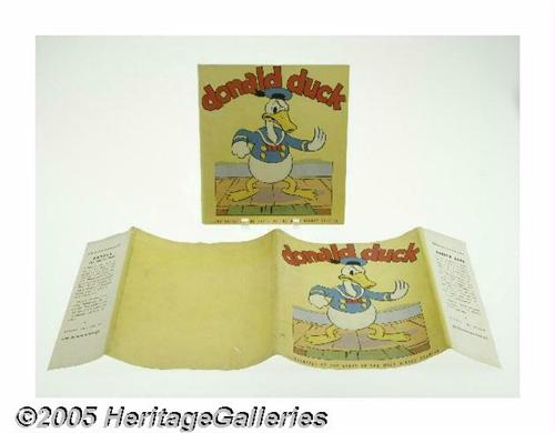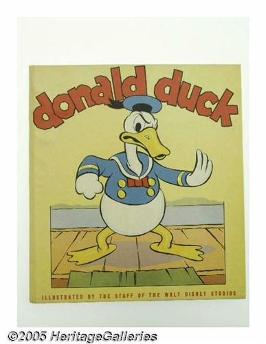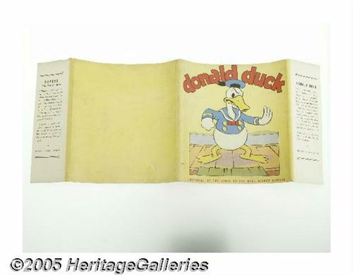 <B>Donald Duck with Dust Jacket (Grosset and Dunlap, 1936).</B></I> For many collectors, finding <I>any</B></I> copy of this 1936 hardcover Whitman is a dream come true -- but for those looking for only the finest, look no further. With high quality pages, tight binding, and only the slightest of wear to the corners and extremities, it's hard to imagine a better one. The delicate spine is completely intact. The dust jacket is complete with no fading. There is some light scuffing (primarily along folds), a small spine tear, a small piece of tape on the back cover, and overall very light wear, but no fading! A major Donald Duck item in absolutely top-notch condition. Some years, Christmas comes early! The book grades Near Mint, the dust jacket is Fine. Overstreet 2005 VF/NM 9.0 value = $3,675; NM- 9.2 value = $4,875. (The preceding values are for the combined book <I>and</B></I> dust jacket in each listed grade). <I>From the Larry Jacobs Collection.</B></I>