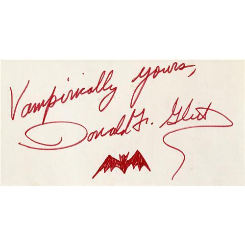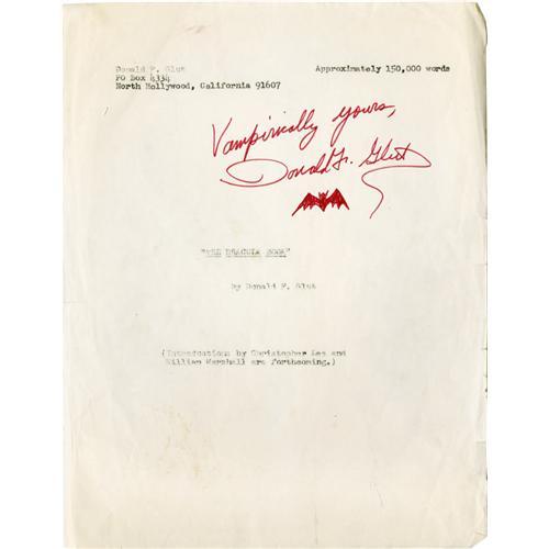 <B>Donald Glut Autograph Manuscript Signed of <I>The Dracula Book.</B></I></B></I> "Had you not answered me in this fashion, I would truly have impaled you on the spot." -Vlad Dracula, September, 1458. This line not only depicts the character of the source of the Dracula legend, but it also initiates the first chapter of this manuscript! This lot features the 504-page- 150,000 word typed manuscript of "The Dracula Book." It is signed cleverly on the first page by the writer as, "<I>Vampirically yours, Donald F. Glut.</B></I>" Below his signature is a drawing of a small bat. The signature is in dark, blood red ink and is very clear and bold. The pages contain editor's marks and occasional notes. <BR><BR>The manuscript is in Good condition, and comes in its original box. The box is falling apart on the edges but the paper inside is in good shape. The notes and type are clear and dark. A hair-raising lot that would be horrific to miss!