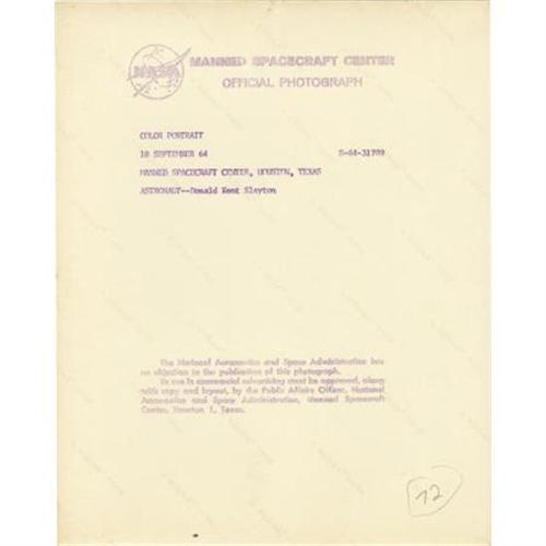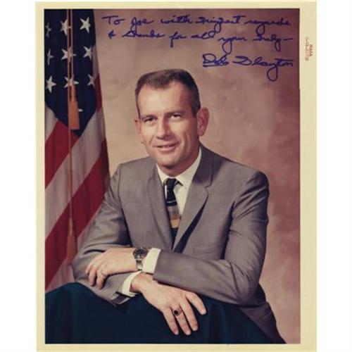 <B>Donald K. Slayton Signed Color Photograph,</B></I> 8" x 10", "<I>To Joe with highest regards/ & thanks for all your help-/ D.K. Slayton.</B></I>" Slayton died in 1993. <I>From the collection of renowned former physical trainer of the astronauts Joe Garino. This lot is accompanied by a signed certificate of authentication from Garino verifying its provenance.</B></I> <BR><BR><b>Shipping:</b> Flat Material, Small (<a target="_blank" href="http://www.heritageauctions.com/common/shipping.php">view shipping information</a>)