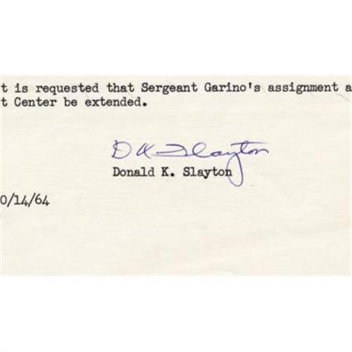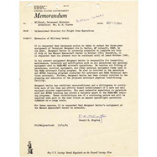 <B>Donald K. Slayton Typed Memorandum Signed</B></I> "<I>D.K. Slayton,</B></I>" one page, 8" x 10.5". U.S. Government Memo, October 15, 1964. Slayton, original Mercury astronaut and Assistant Director for Flight Crew Operations, requests Joe Garino's assignment at the Manned Spacecraft Center to be extended at least one year. Two file holes and staple hole in upper blank margin. <I>From the collection of renowned former physical trainer of the astronauts Joe Garino. This lot is accompanied by a signed certificate of authentication from Garino verifying its provenance.</B></I><BR><BR><b>Shipping:</b> Flat Material, Small (<a target="_blank" href="http://www.heritageauctions.com/common/shipping.php">view shipping information</a>)