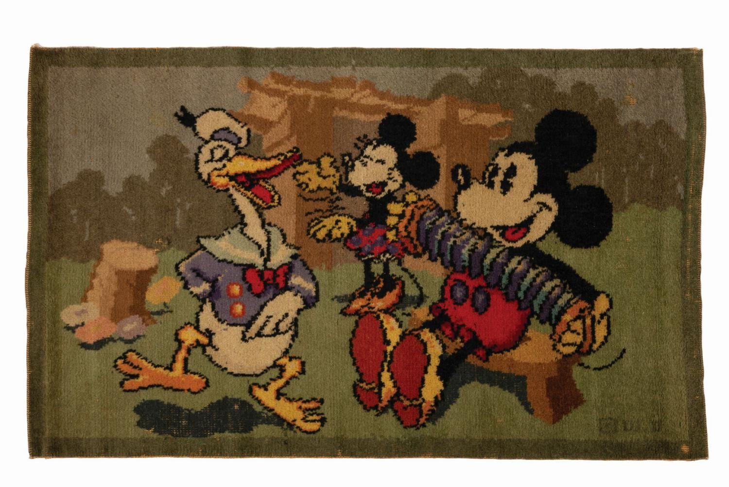 (Disney, c.1930s). A vintage woven tapestry rug depicting Mickey Mouse playing the squeezebox as a long-billed Donald Duck and Minnie Mouse dance in a wooded outdoor setting. Measuring 44"x26", the piece is in good condition with scattered bare spots, areas of light soiling, and color softening from age.
