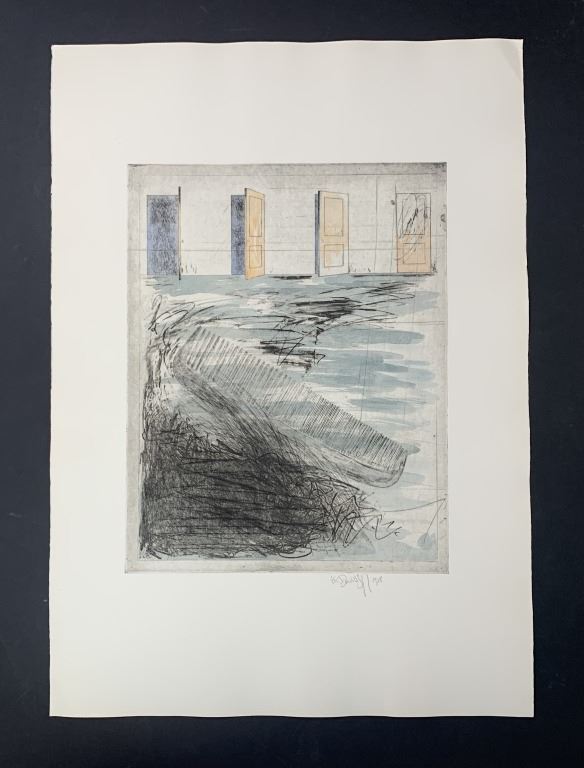 Donald Saff's "Four Doors" limited edition print, signed and numbered 1/50 lower middle. This is an interesting piece of a comb in the middle, with four doors in the background, each opened at a different angle. This piece is in near excellent condition with a miniscule wrinkle lower right corner, and lightly creased upper right corner.
