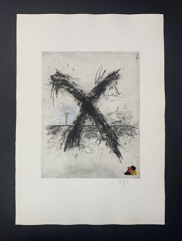 Donald Saff's "Screw" limited edition print, signed and numbered 39/50 lower middle. This is an interesting piece of an 'X' in the middle, with a screw screwed into something, and a dab of red/black/yellow colour lower right. This piece is in near excellent condition with a miniscule wrinkle lower left corner, upper left corner and upper right corner. creased upper right corner.