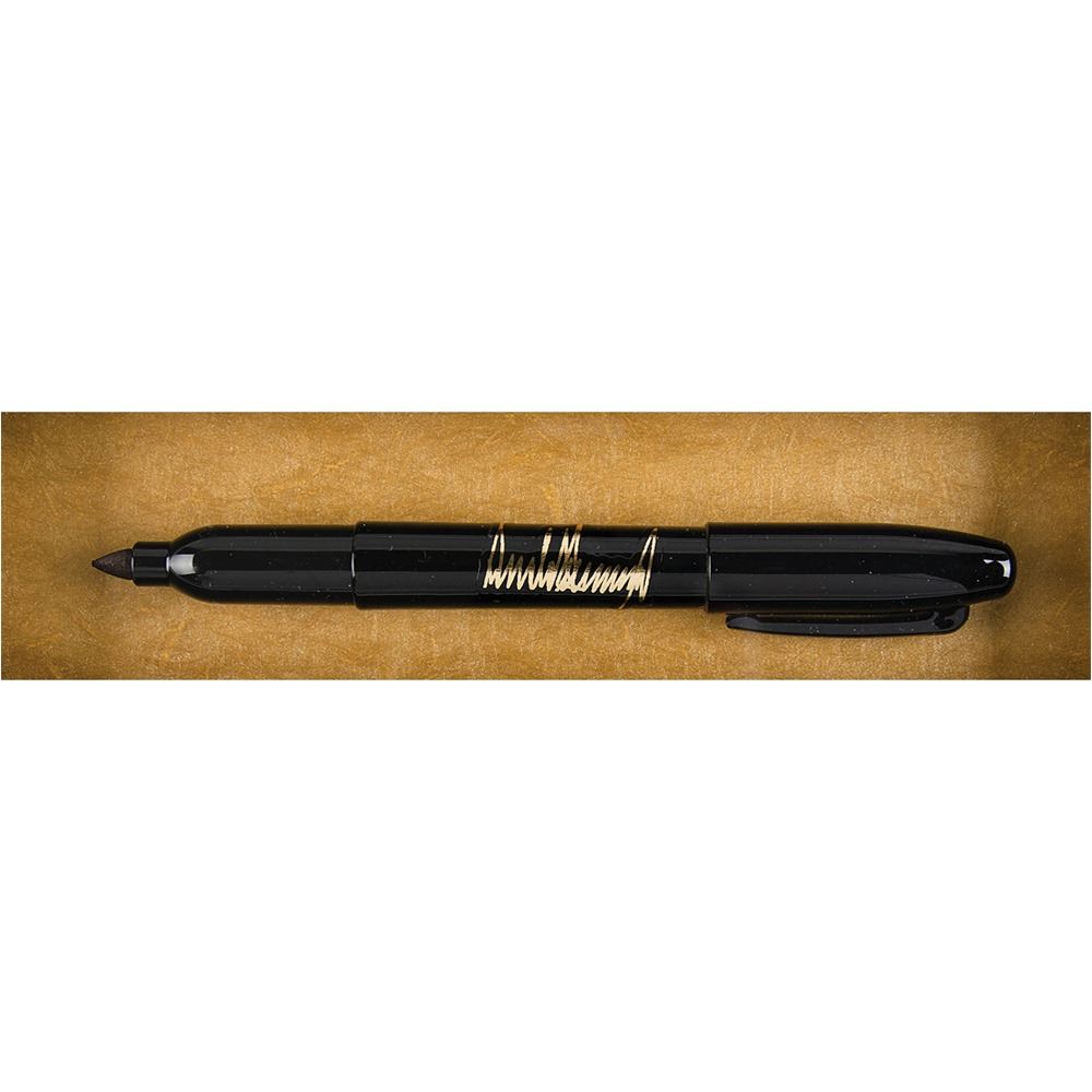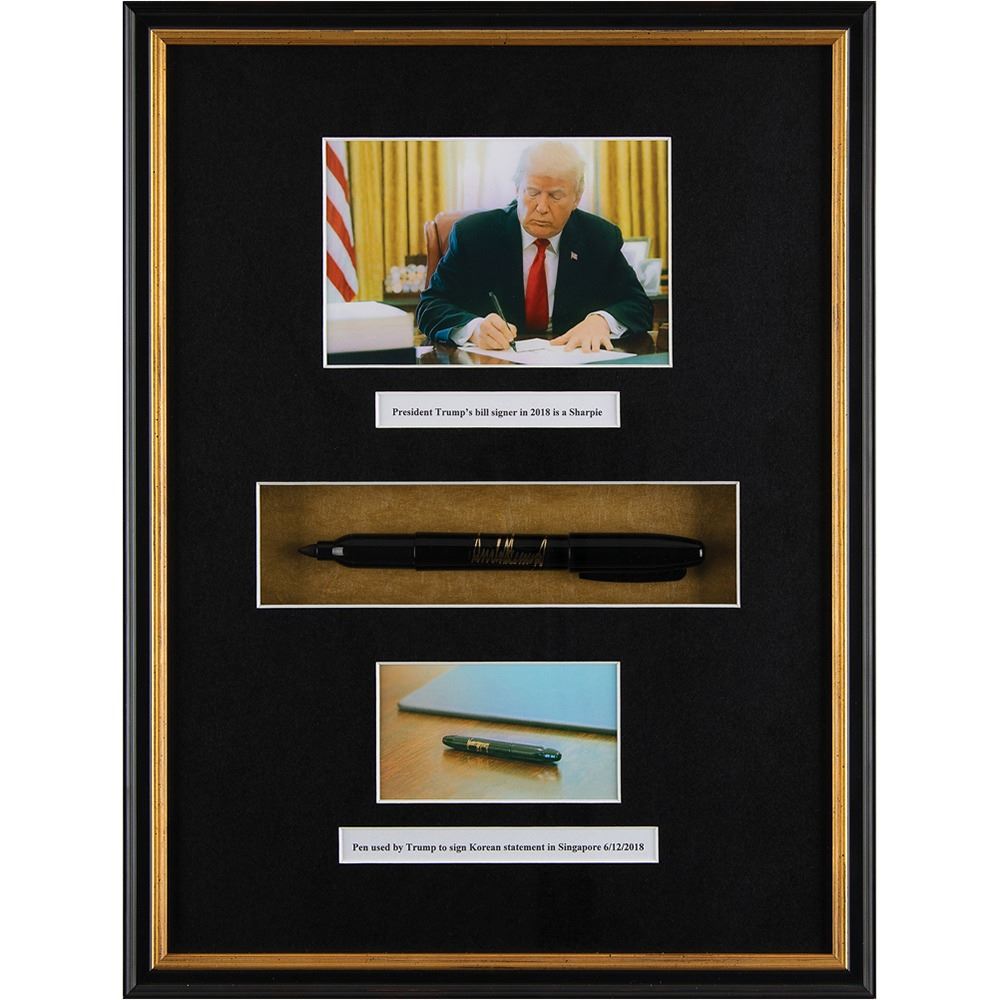 Thick felt tip pen attributed to President Donald Trump's signing of a Korean statement in Singapore on June 12, 2018, during his unprecedented conference with Kim Jong Un. The black 'bill signer' measures 6.75Ë long with cap on the rear, and features Trump's facsimile signature emblazoned in gold. Mounted, matted, and framed with two captions and images to an overall size of 12.5 x 16.5. In fine condition.