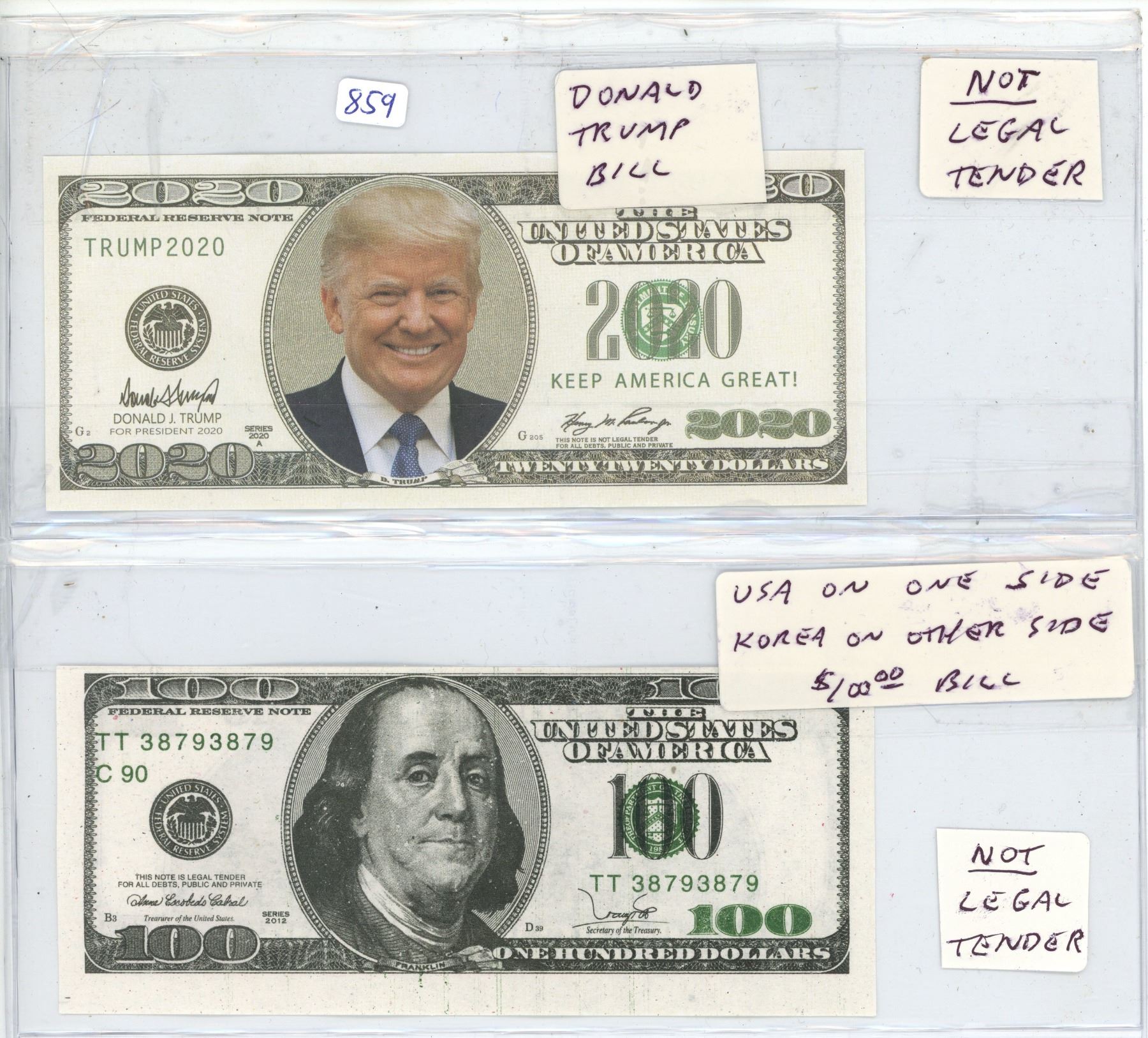 Donald Trump Bill and USA on one Side/Korea on Other Side- 100 Dollar bill- Both not legal Tender