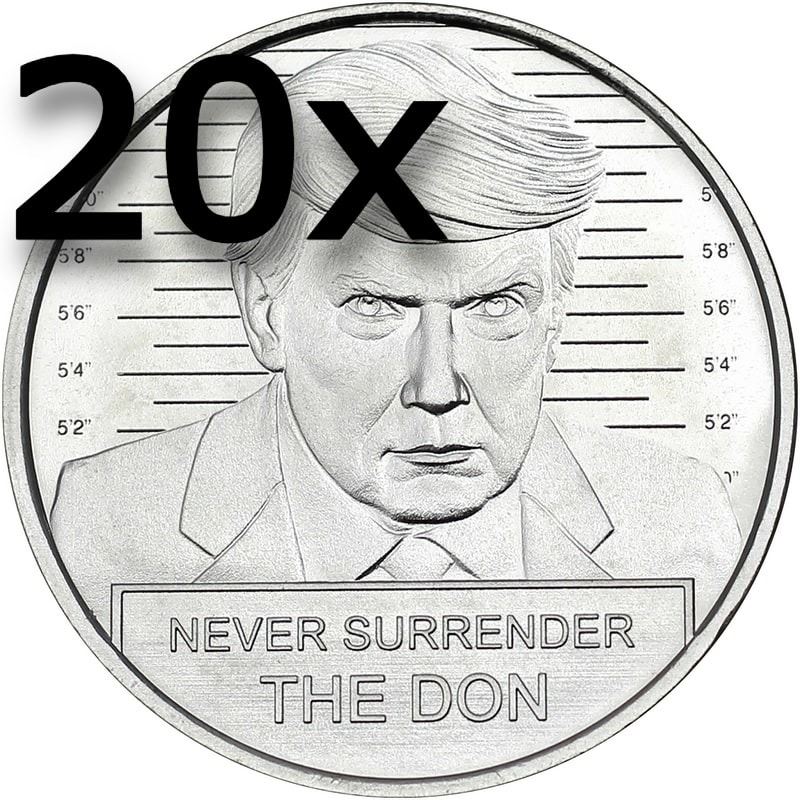 Bundle of twenty 1oz .999 fine silver coins featuring the "Trump Mugshot" design. A bold and provocative collector's set capturing a defining cultural image. Each coin contains one troy ounce of fine silver--ideal for collectors and investors alike.