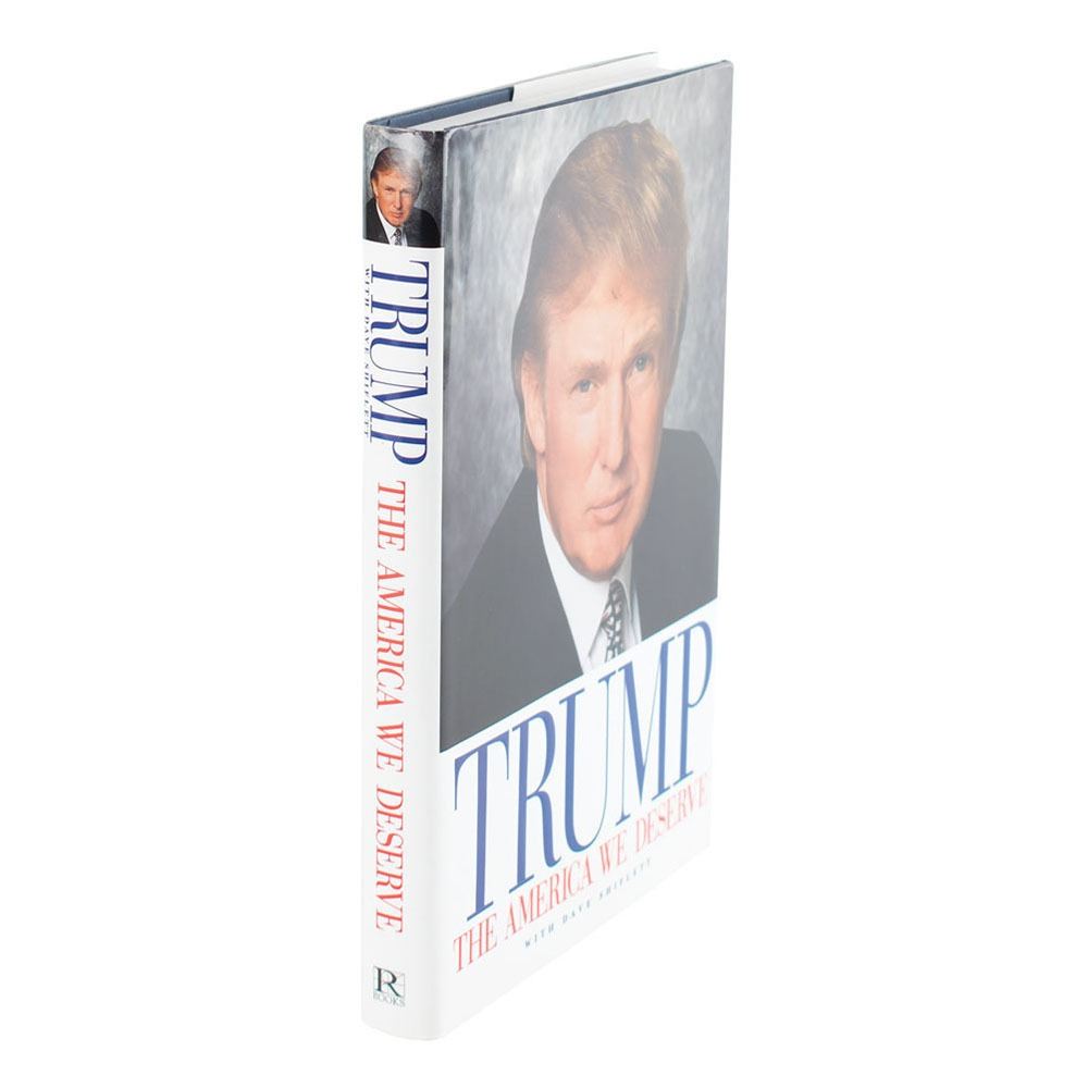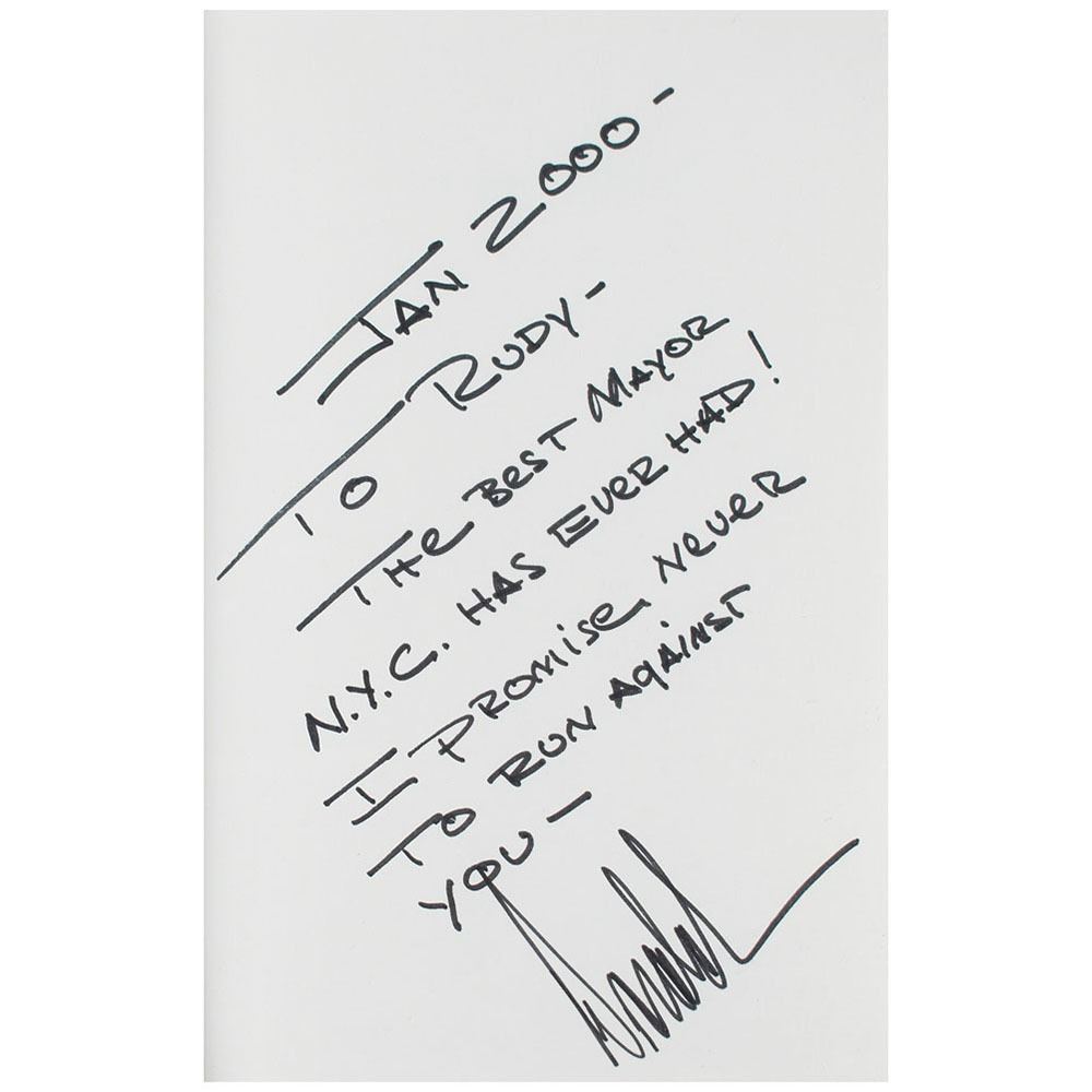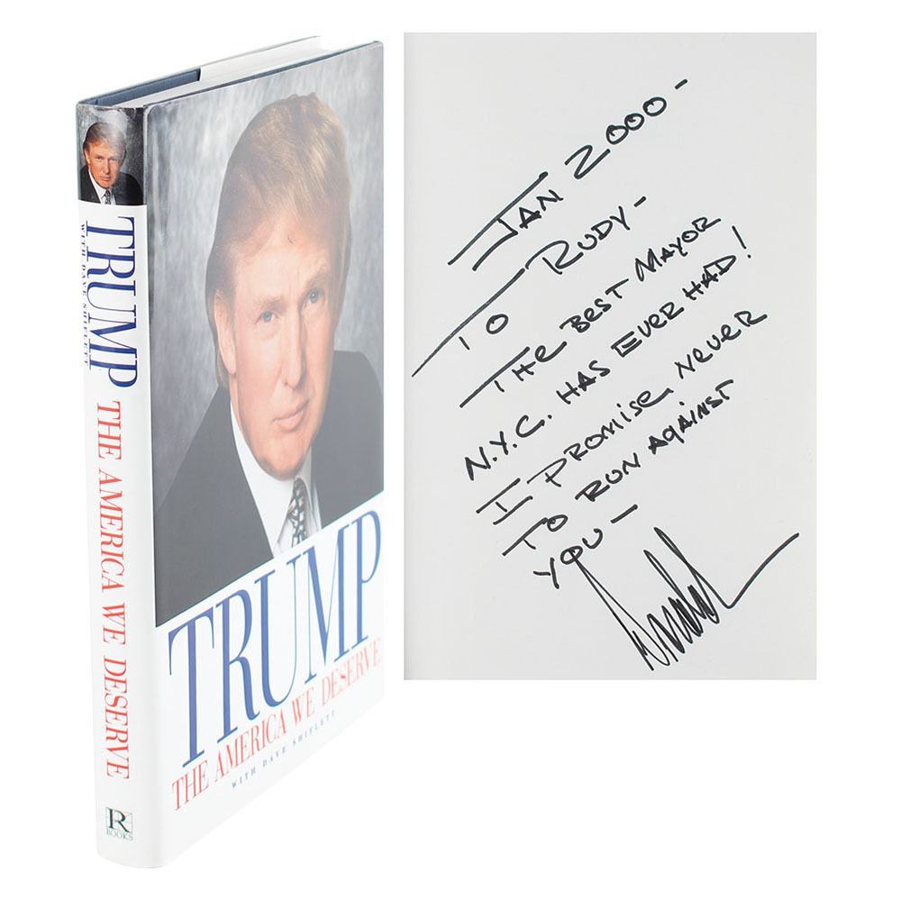 Rare signed book with an important association: Trump: The America We Deserve. First edition. Los Angeles: Renaissance Books, 2000. Hardcover with dust jacket, 6.25 x 9.25, 286 pages. Signed and inscribed on the first free end page in black felt tip to Rudy Giuliani, "Jan 2000—To Rudy—The best mayor N.Y.C. has ever had! I promise never to run against you—Donald." In very fine condition. A remarkable New York City association, long pre-dating their controversial White House years.
