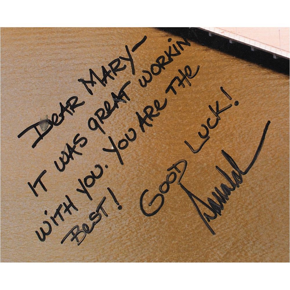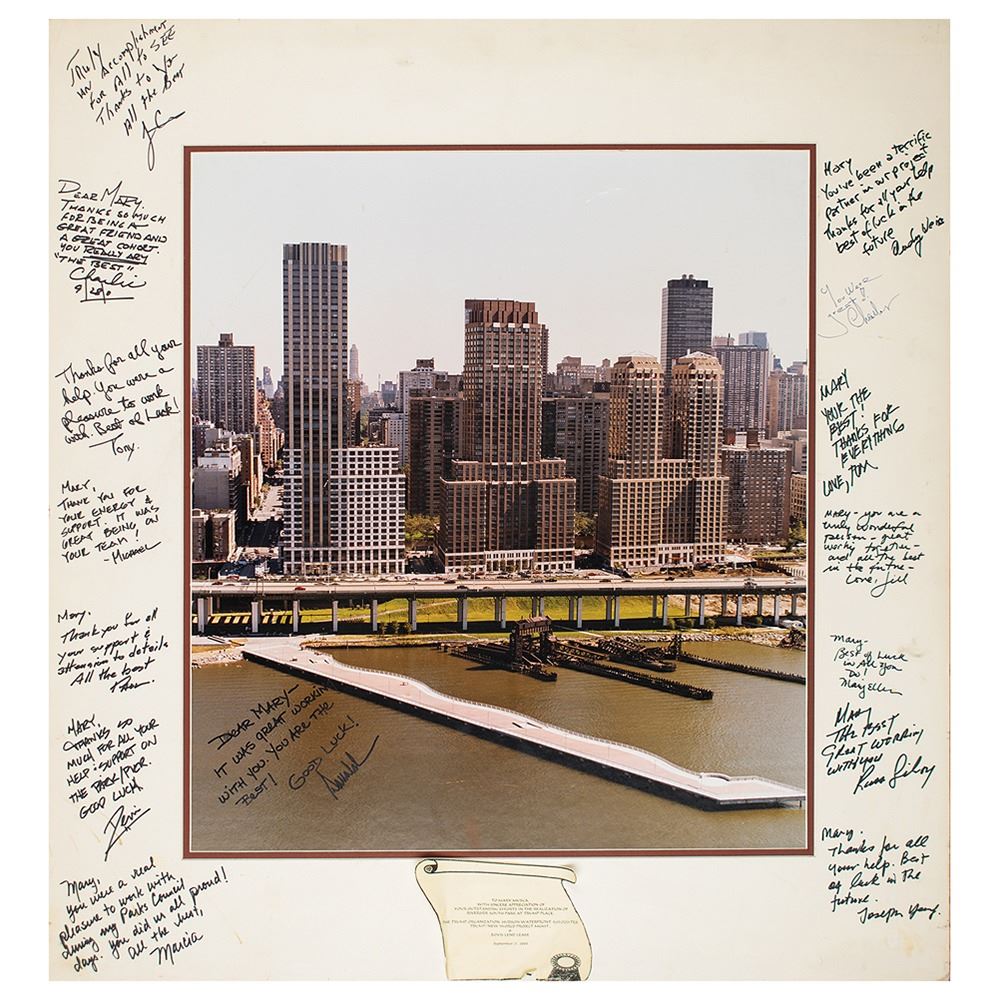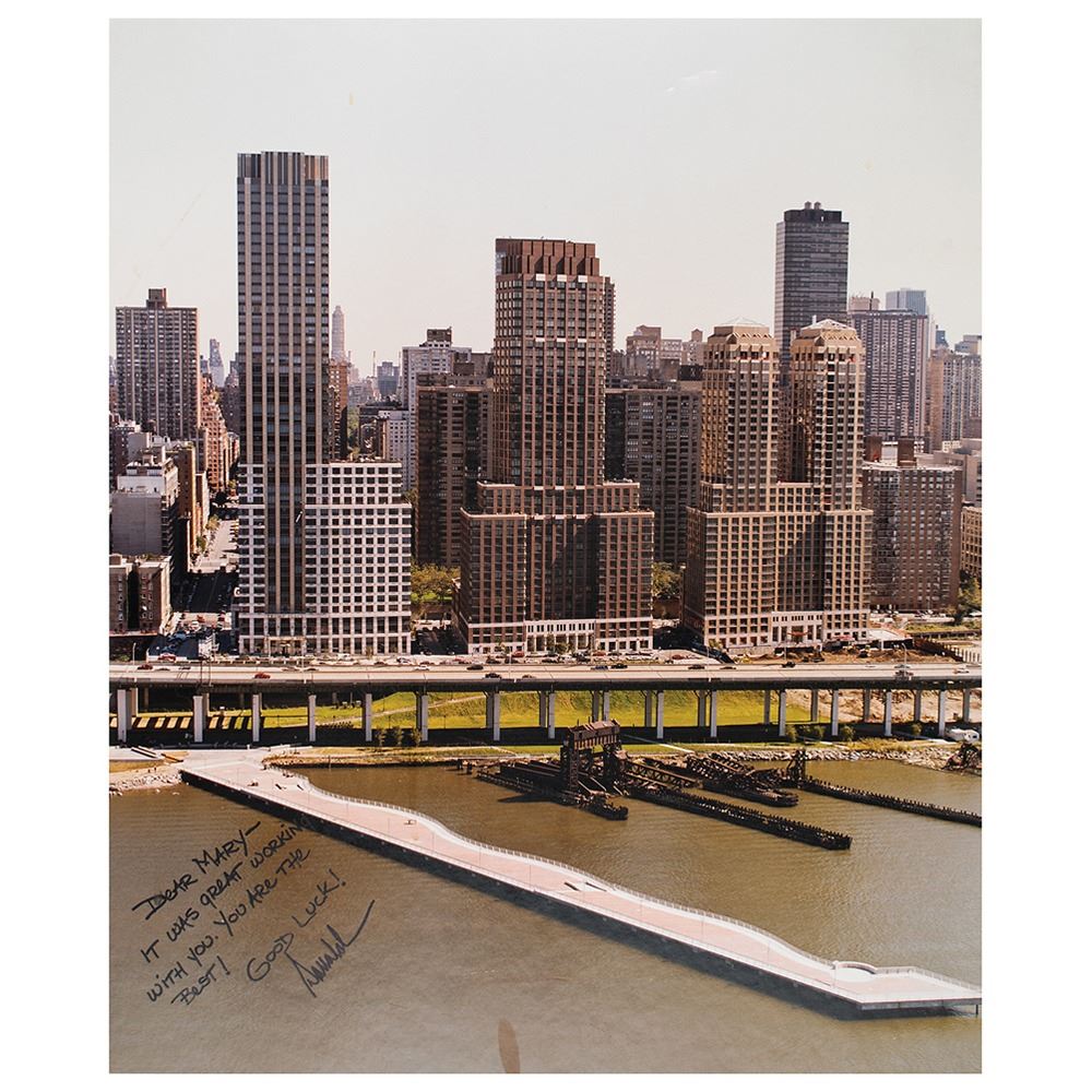 Large color semi-glossy 19.25 x 23.5 photo of Riverside South Park on the Upper West Side of Manhattan, signed and inscribed in black felt tip, "Dear Mary—It was great workin with you. You are the best! Good luck! Donald.†The photo is double-matted to an overall size of 28.5 x 32.5, with the lower portion bearing an affixed 'scroll' caption presenting the photo to Mary Musca on September 27, 2000, for her "outstanding efforts in the realization of Riverside South Park at Trump Place." Additionally, the mat border is signed by 14 of Musca's coworkers and project associates. In fine condition, with a trivial brush to Trump's inscription, some light soiling to the mat, and a few small dents to the top of the image.