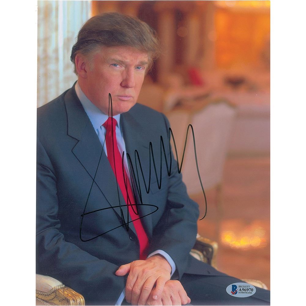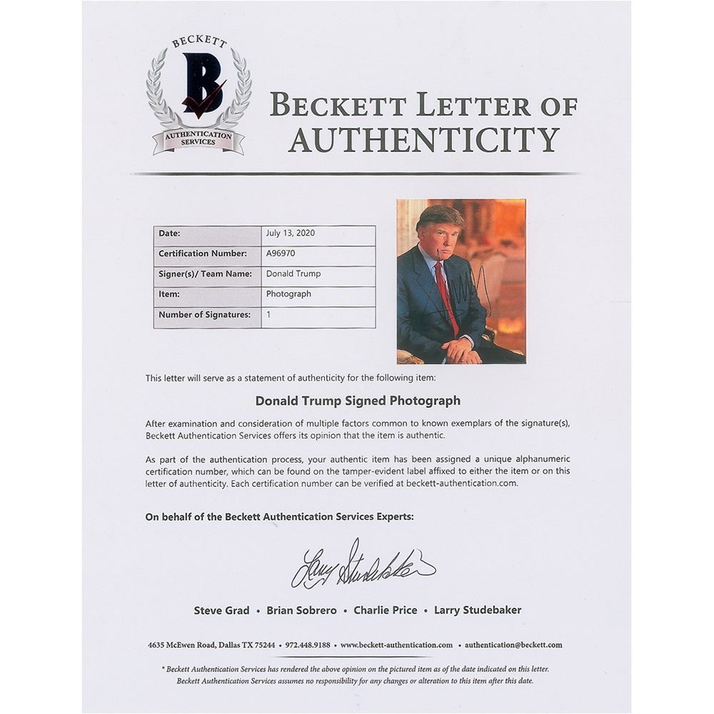 Color glossy 7.75 x 10.25 photo of Trump in a suit and tie, signed in black felt tip. In fine condition, with a Beckett label affixed to the lower corner. Accompanied by a full letter of authenticity from Beckett Authentication Services.