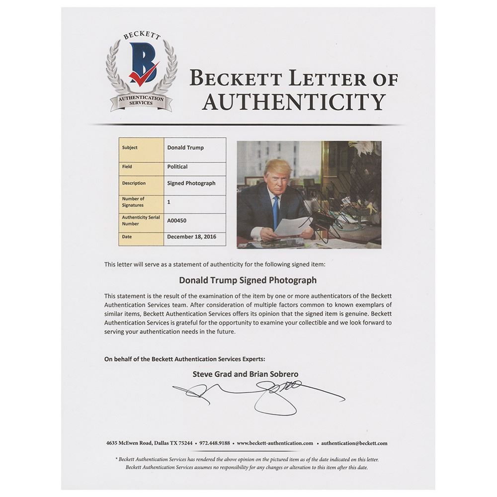 Amusing color satin-finish 11 x 8.5 photo of Donald Trump seated at his desk next to a bald eagle, signed in black felt tip. In very fine condition, with a Beckett label affixed to the lower left corner. Accompanied by a full letter of authenticity from Beckett Authentication Services.