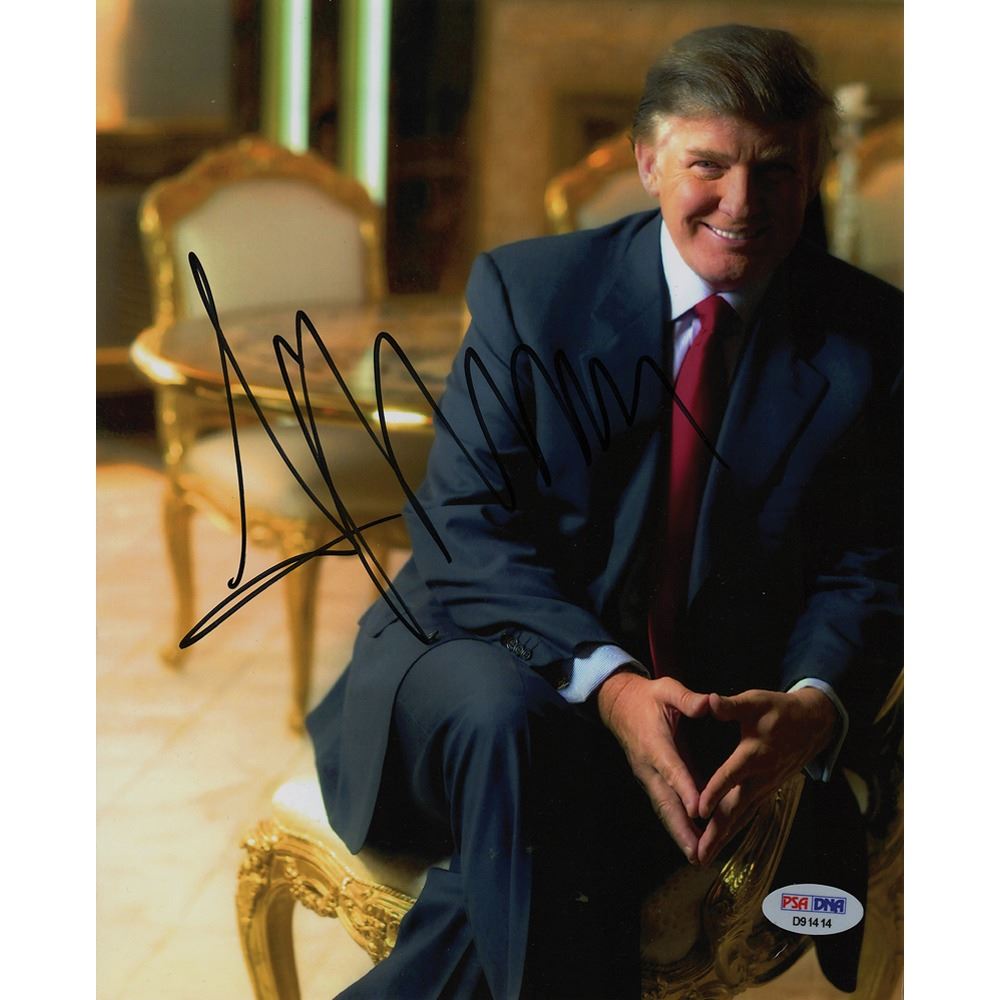 Color 8 x 10 photo of Donald Trump seated on a golden chair, signed in black felt tip. In fine condition, with a PSA/DNA label affixed to the lower right corner (certificate of authenticity not present).