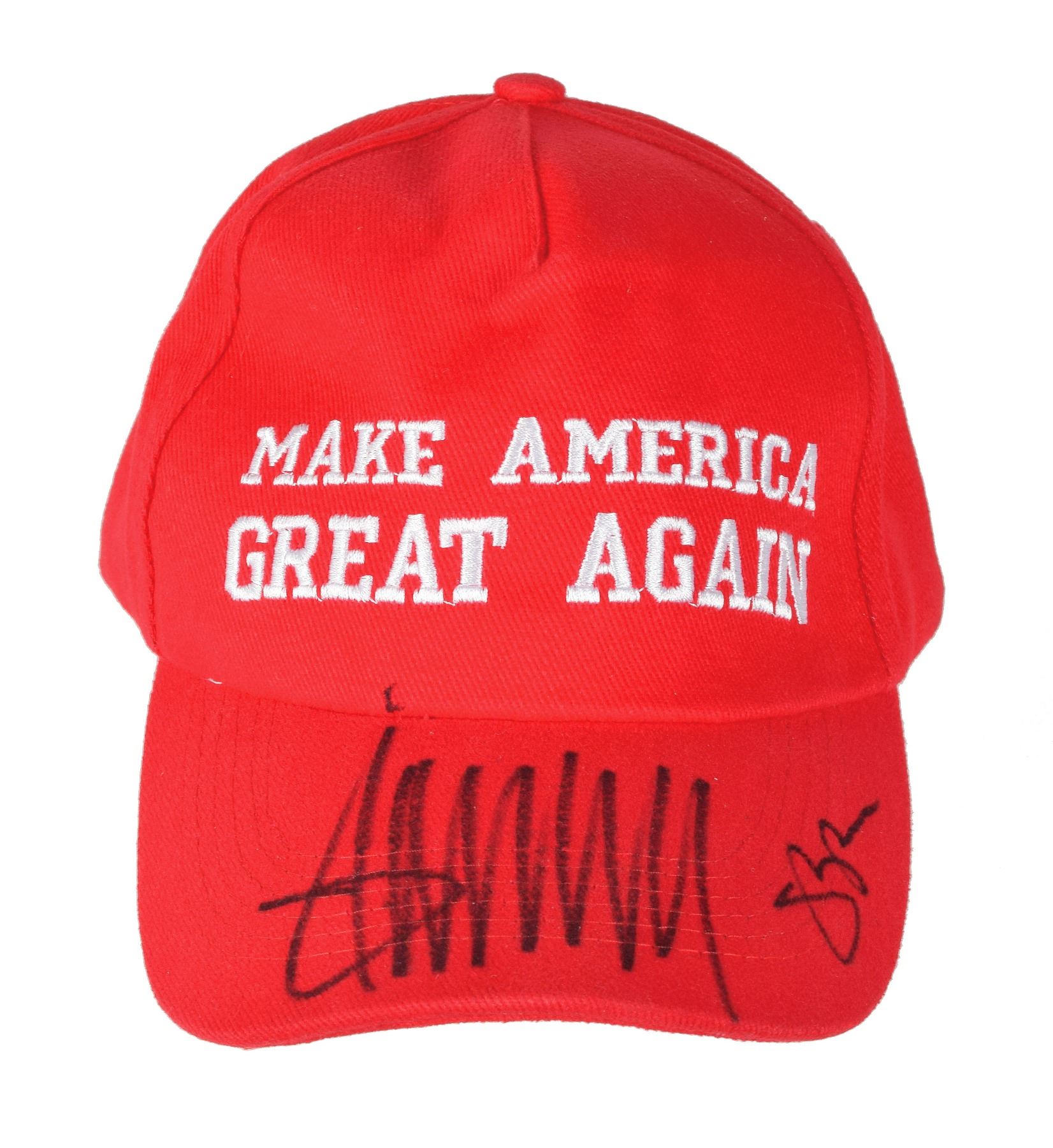 Iconic red "Make America Great Again" cotton cap with Velcro back, popularized during the presidential campaign of Donald Trump, prominently signed on the brim in black felt tip by Trump and Pence. In fine condition.