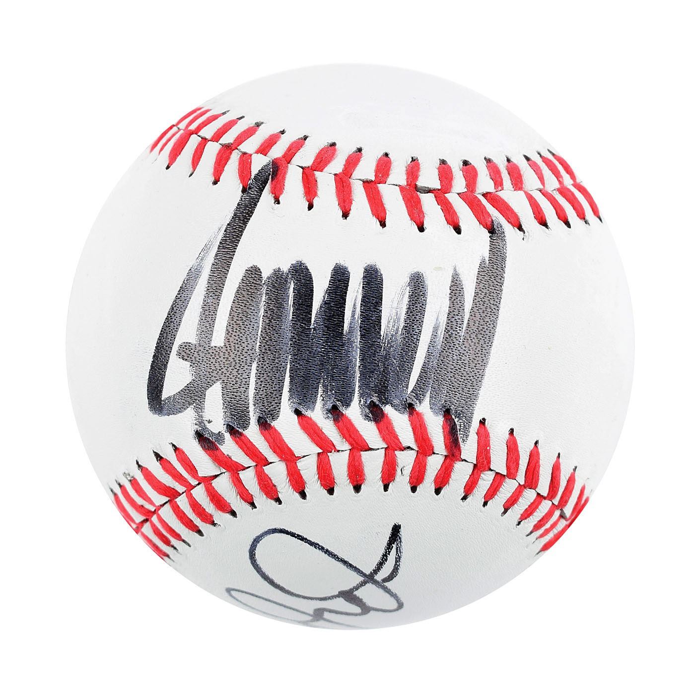 Fantastic Rawlings Official League baseball signed on the sweet spot in black felt tip by Donald Trump, and on the lower panel by Mike Pence. In very fine condition. Accompanied by a full letter of authenticity from Beckett Authentication Services. A highly sought-after format connecting America's national pastime to its highest office.