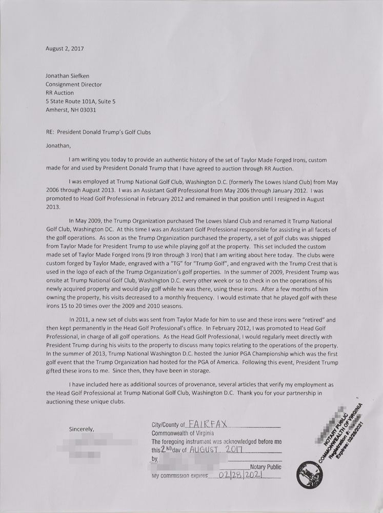 Accompanied by a detailed notarized letter of provenance describing their history, in part: “I was employed at Trump National Golf Club, Washington D.C. (formerly The Lowes Island Club) from May 2006 to August 2013…In May 2009, the Trump Organization purchased the The Lowes Island Club and renamed it Trump National Golf Club…As soon as the Trump Organization purchased the property, a set of golf clubs was shipped from Taylor Made…This set included the custom made set of Taylor Made Forged Irons (9 Iron through 3 Iron) that I am writing about here today…In the summer of 2009, President Trump was onsite at Trump National Golf Club, Washington D.C. every other week or so to check in on the operations of his newly acquired property and would play golf while he was there, using these irons. After a few months of him owning the property, his visits decreased to a monthly frequency. I would estimate that he played golf with these irons 15 to 20 times over the 2009 and 2010 seasons.