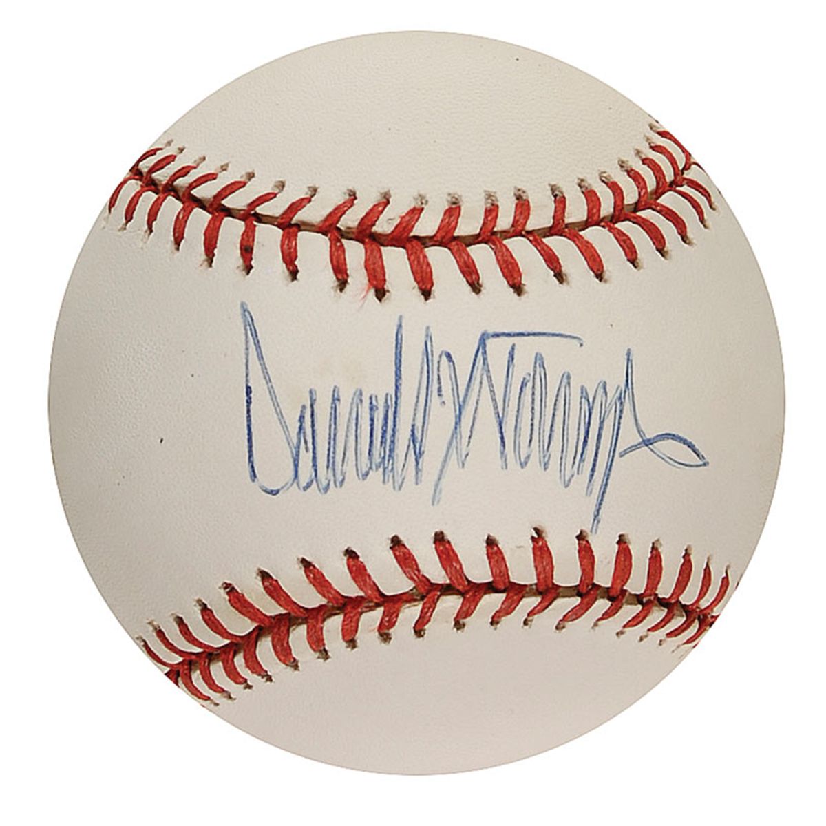 Official Rawlings National League baseball signed in blue ballpoint on the sweet spot “Donald Trump.” In fine condition, with a few tiny scuffs not affecting the signature.