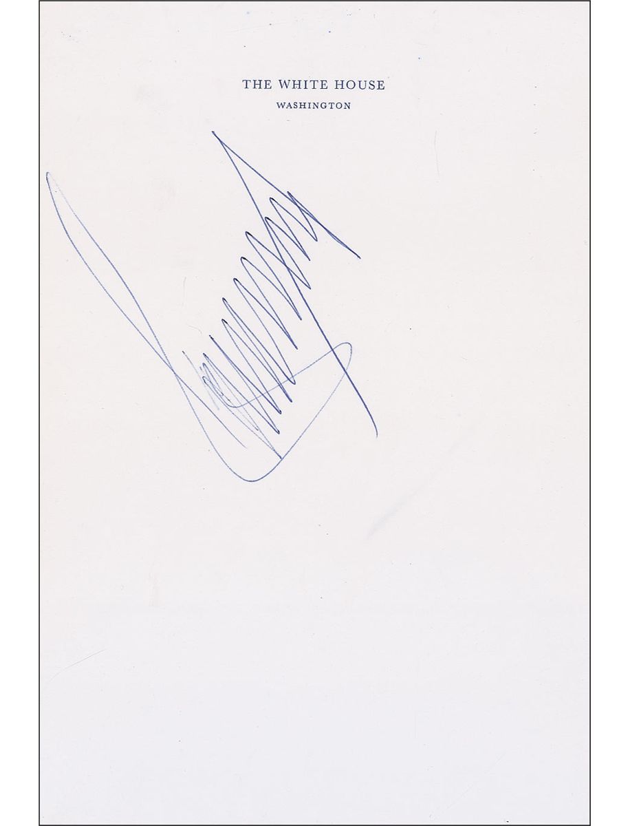 Two items: formidable color glossy 8 x 10 of Trump leaning over a table, signed vertically in blue felt tip; and a ballpoint signature on a 6.25 x 9.25 sheet of mock White House letterhead. In fine condition.