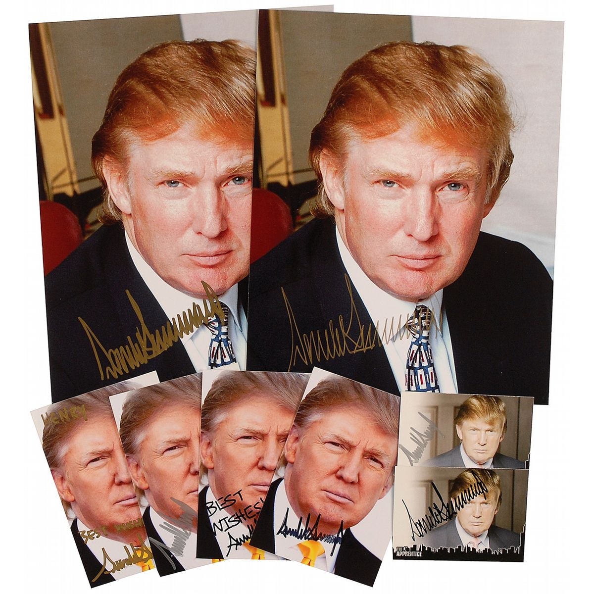 Eight signed photos: two identical color glossy 8 x 10 photos of Trump signed in gold ink; four identical 3.5 x 5 photos of Trump signed in black felt tip, gold ink, and silver ink, with one inscribed to “Henry”; and two color 3.5 x 2.5 Apprentice cards, signed in silver ink and black felt tip. In overall fine condition.