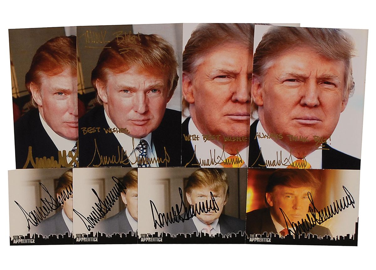 Eight items: four color 3.5 x 5 photos of Trump, each signed in gold ink; and four color 3.5 x 2.5 Apprentice trading cards, each signed in black felt tip. In overall fine condition.