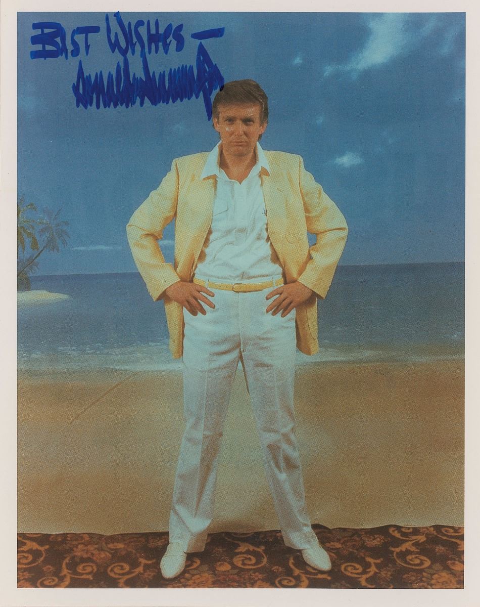 Color glossy 8 x 10 full-length photo of Trump standing in front of a tropical backdrop with his arms akimbo, signed in blue felt tip, “Best wishes—Donald Trump.” In fine condition, with faint background lettering inherent to the original negative and a slightly grainy quality to the image.