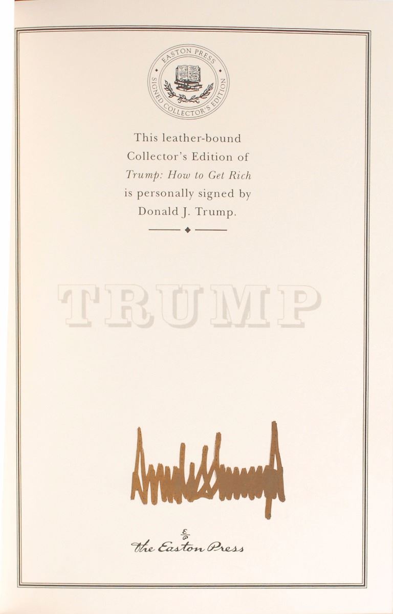 Signed book: How to Get Rich. Collector’s edition. Norwalk, CT: Easton Press, 2004. Leather-bound hardcover, 7.25 x 10.25, 244 pages. Signed on the colophon in gold ink, “Donald J. Trump.” In fine condition. A desirable, uncommon fully signed edition.