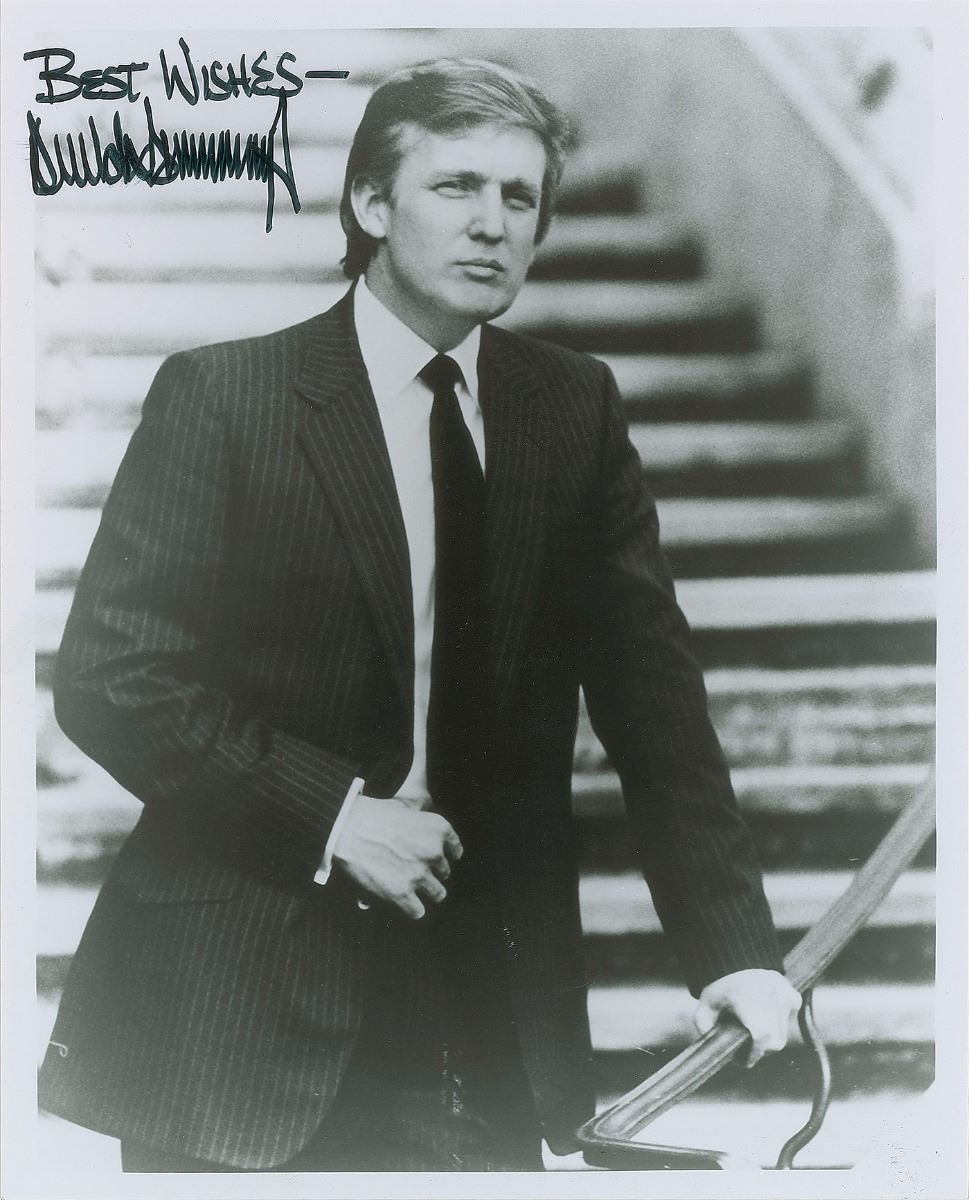 Choice glossy 8 x 10 photo of Trump in a pinstriped business suit, signed in the upper left in thick black felt tip, “Best Wishes—Donald Trump.” In fine condition.