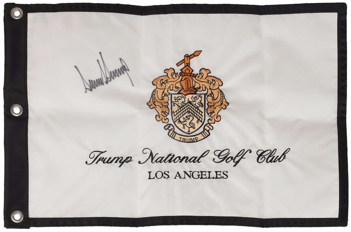 Trump National Golf Club canvas golf flag, 21.25 x 13.5, with embroidered Trump golf crest, signed in black felt tip. In fine condition, with light feathering to the ink due to the nature of the fabric.