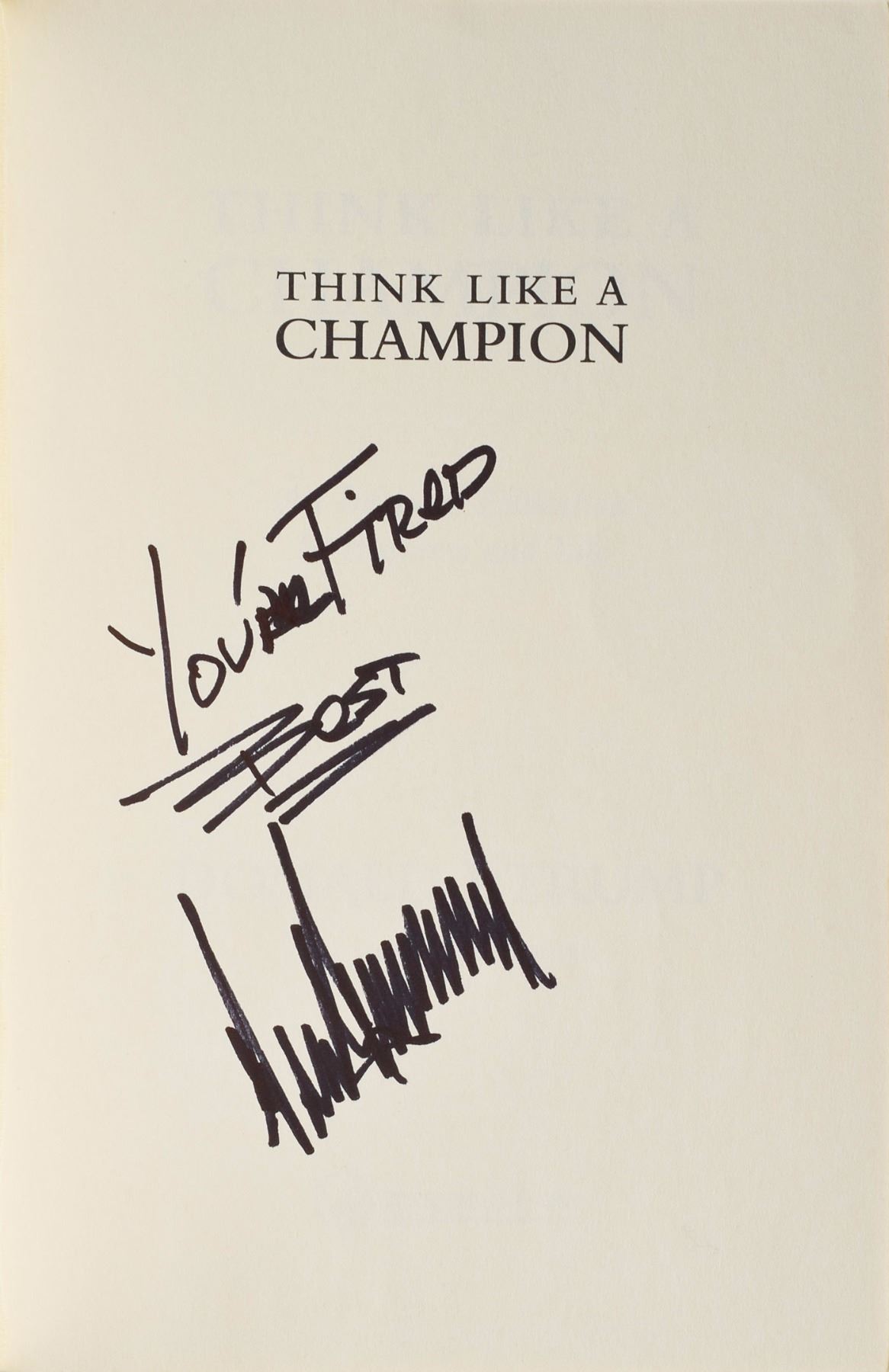 Signed book: Think Like a Champion. First edition. NY: Vanguard Press, 2009. Paperback, 5.5 x 8.25, 204 pages. Signed on the half-title page in black felt tip, "You're fired, Best, Donald Trump." In fine condition. Accompanied by a ticket for a Spark event at Harbour Station in Saint John, New Brunswick, on October 6, 2011, which included Trump among the key speakers.