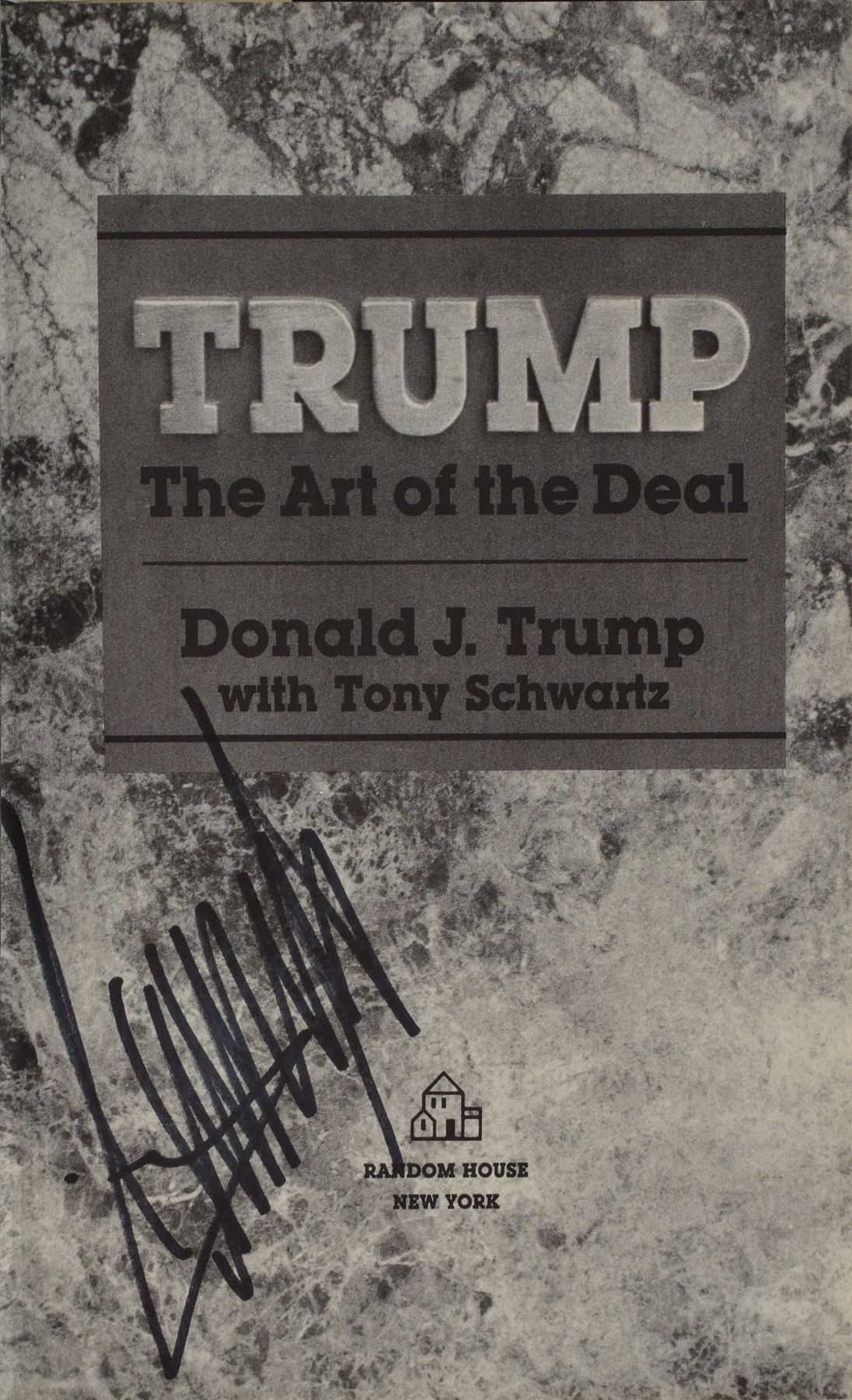 Signed book: The Art of the Deal. Later printing. NY: Random House, 1987. Hardcover with dust jacket, 6.25 x 9.5, 246 pages. Signed on the title page in black felt tip. In fine condition. Accompanied by a certificate of authenticity from PSA/DNA.
