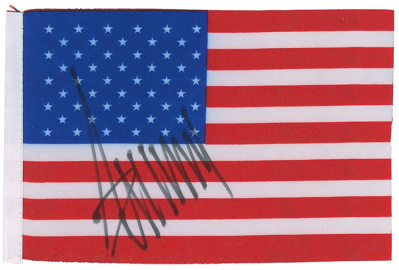 Desirable fabric American flag, 9 x 5.75, signed in black felt tip by Trump. In fine condition, with a light diagonal crease.