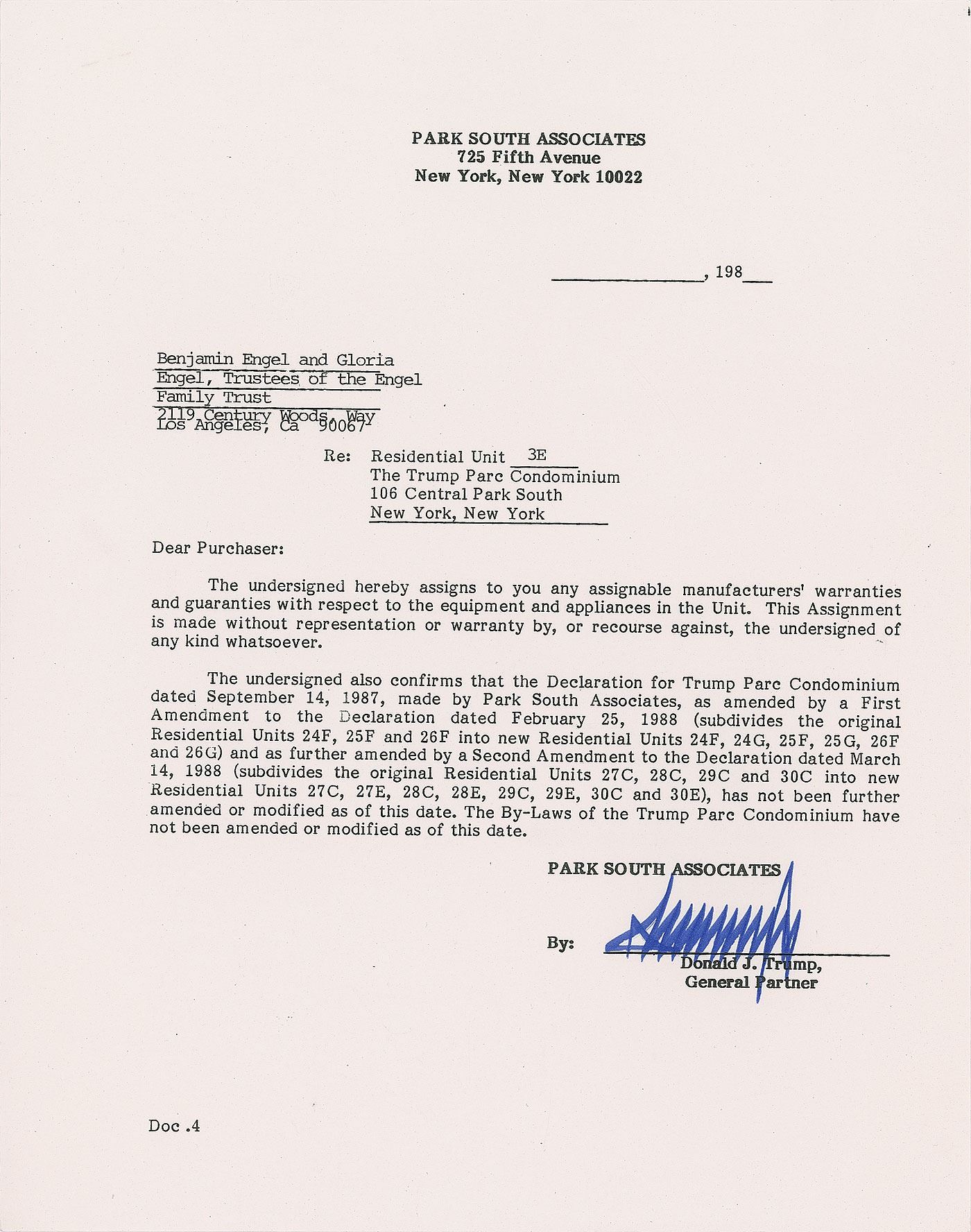 DS, one page, 8.5 x 11, no date but circa 1980s. Letter of agreement between Benjamin and Gloria Engel and Donald Trump, in which the latter assigns "any assignable manufacturers' warranties and guaranties with respect to the equipment and appliances" in residential unit 3E in the Trump Parc Condominium. Signed at the conclusion in blue felt tip by Trump. In fine condition. Accompanied by a full letter of authenticity from JSA.
