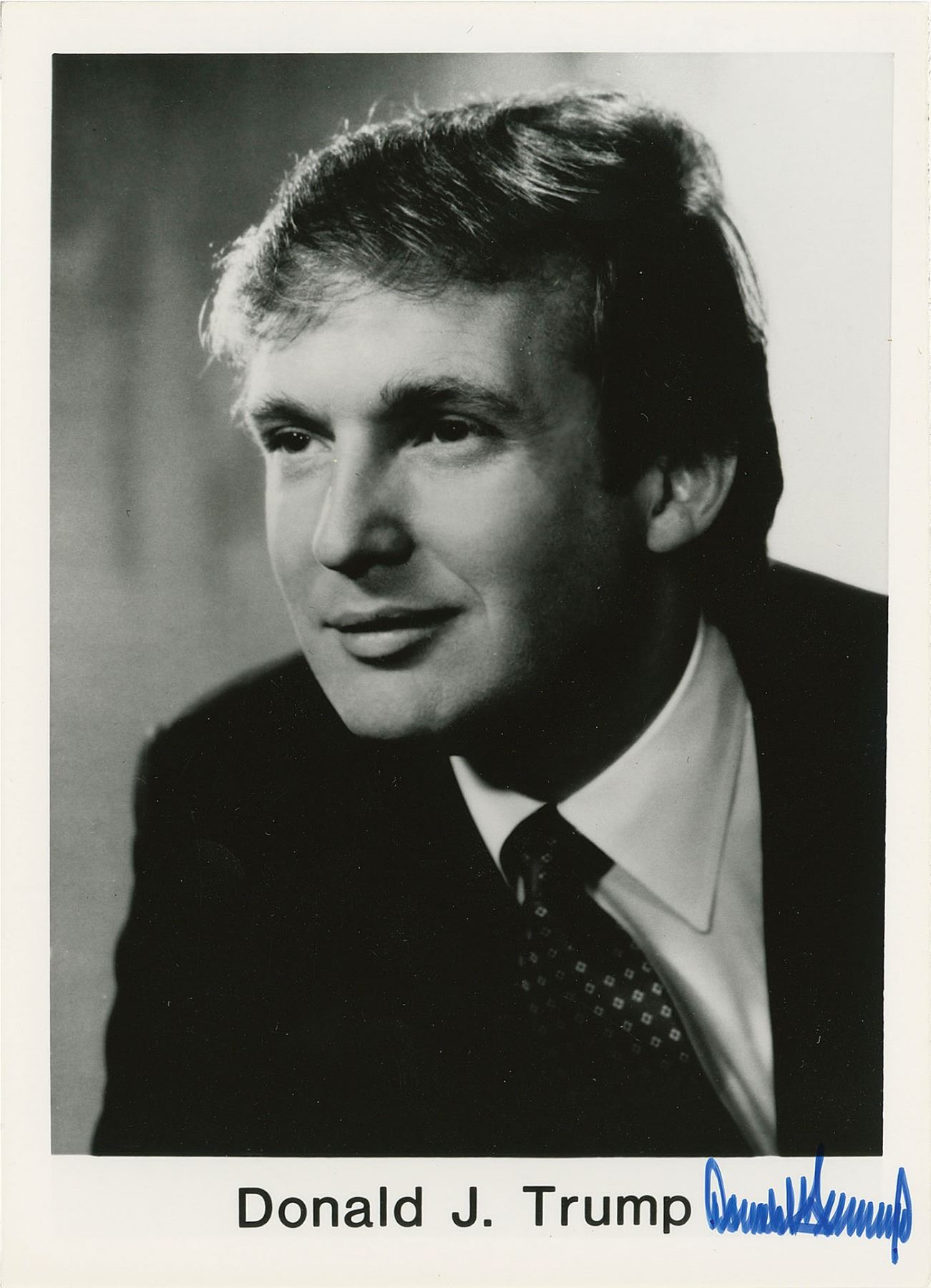 Glossy 5 x 7 publicity photo of the future 45th American president, signed in the lower right corner in blue felt tip by Trump. In very fine condition.