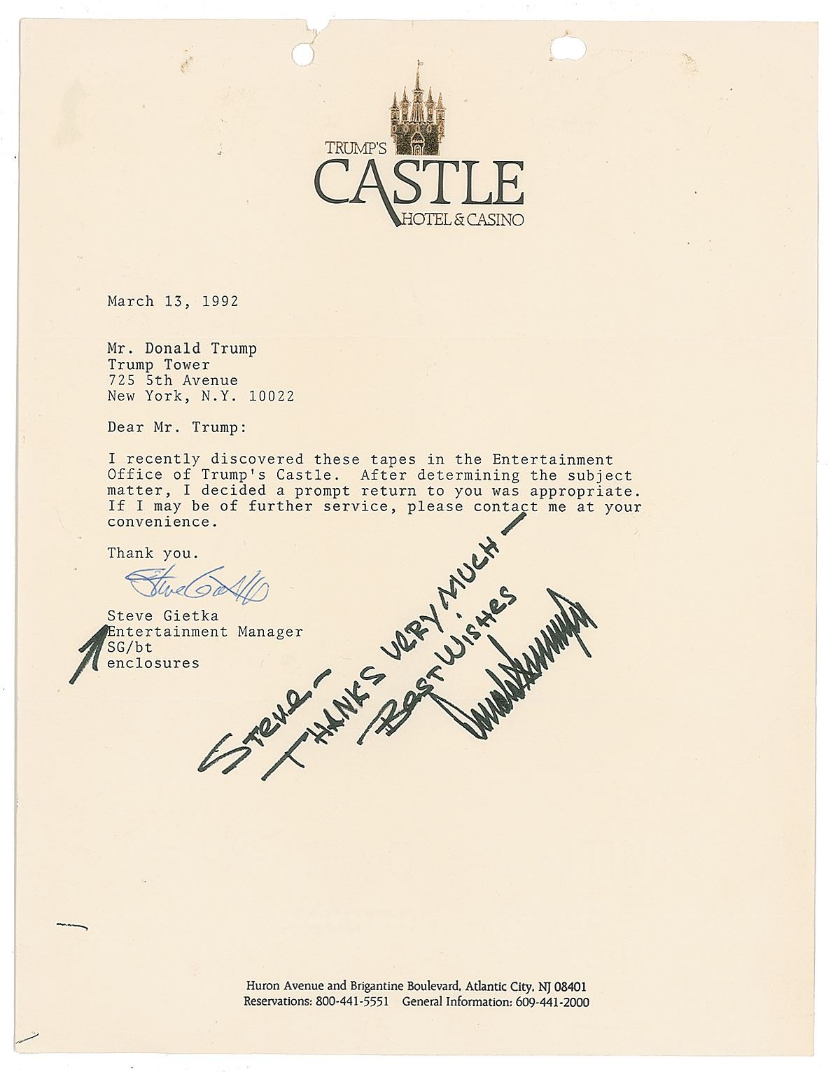 Typed letter sent to Trump by a manager at his bankrupt Atlantic City hotel and casino, one page, 8.5 x 11, Trump's Castle letterhead, March 13, 1992, signed and inscribed at the conclusion in black felt tip, "Steve—Thanks Very Much—Best Wishes, Donald Trump." The letter reads, in full: "I recently discovered these tapes in the Entertainment Office of Trump's Castle. After determining the subject matter, I decided a prompt return to you was appropriate. If I may be of further service, please contact me at your earliest convenience." In fine condition, with two file holes to the top. Trump's Castle filed for bankruptcy in the month of this letter, March 1992, although he reacquired full ownership in a refinancing deal the following year (only to lose it to bankruptcy again, several years later); today, the hotel and casino is operated as the Golden Nugget Atlantic City. Given the allegations that swirl around Trump and his presidency, one's imagination can run rampant about what might have been on these tapes, deemed worthy of a "prompt return" by one of his managers.