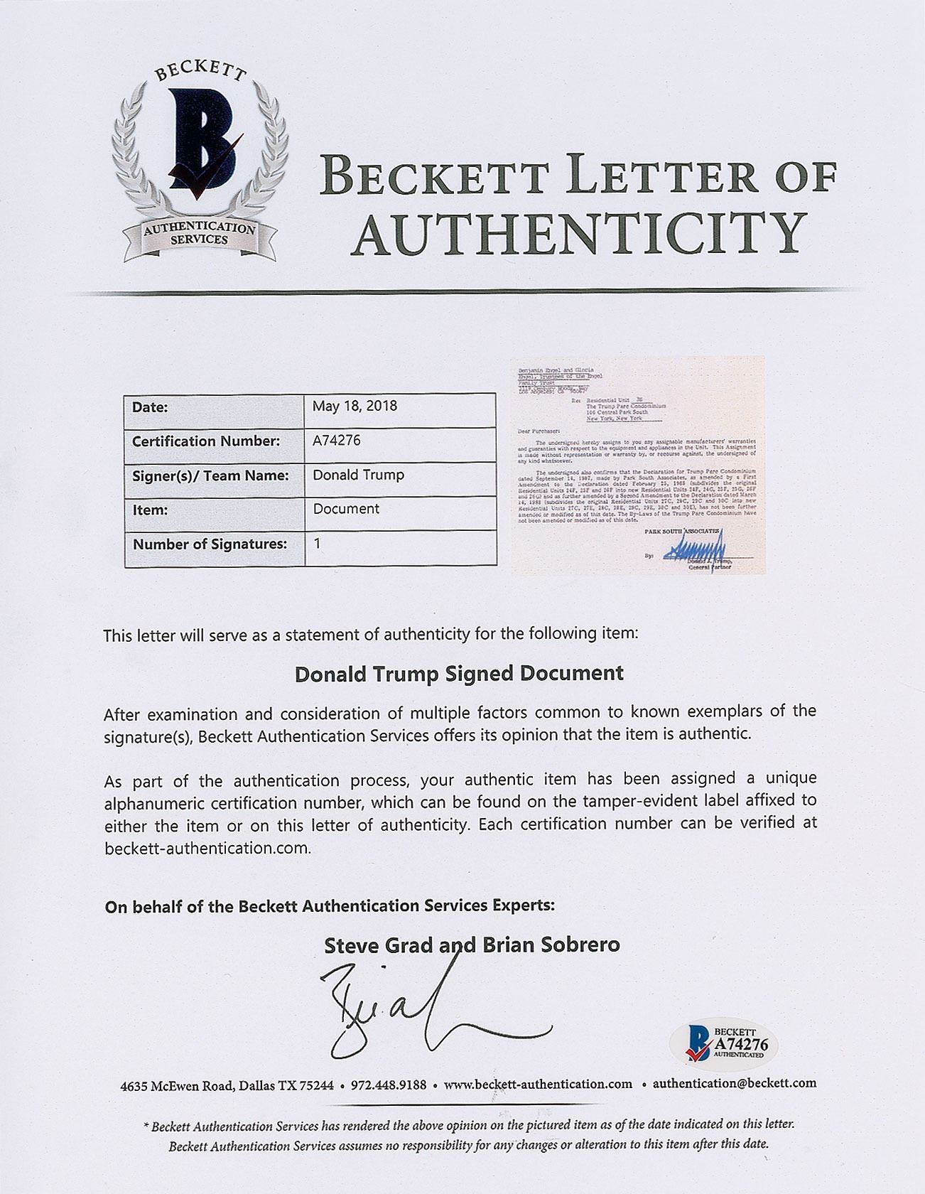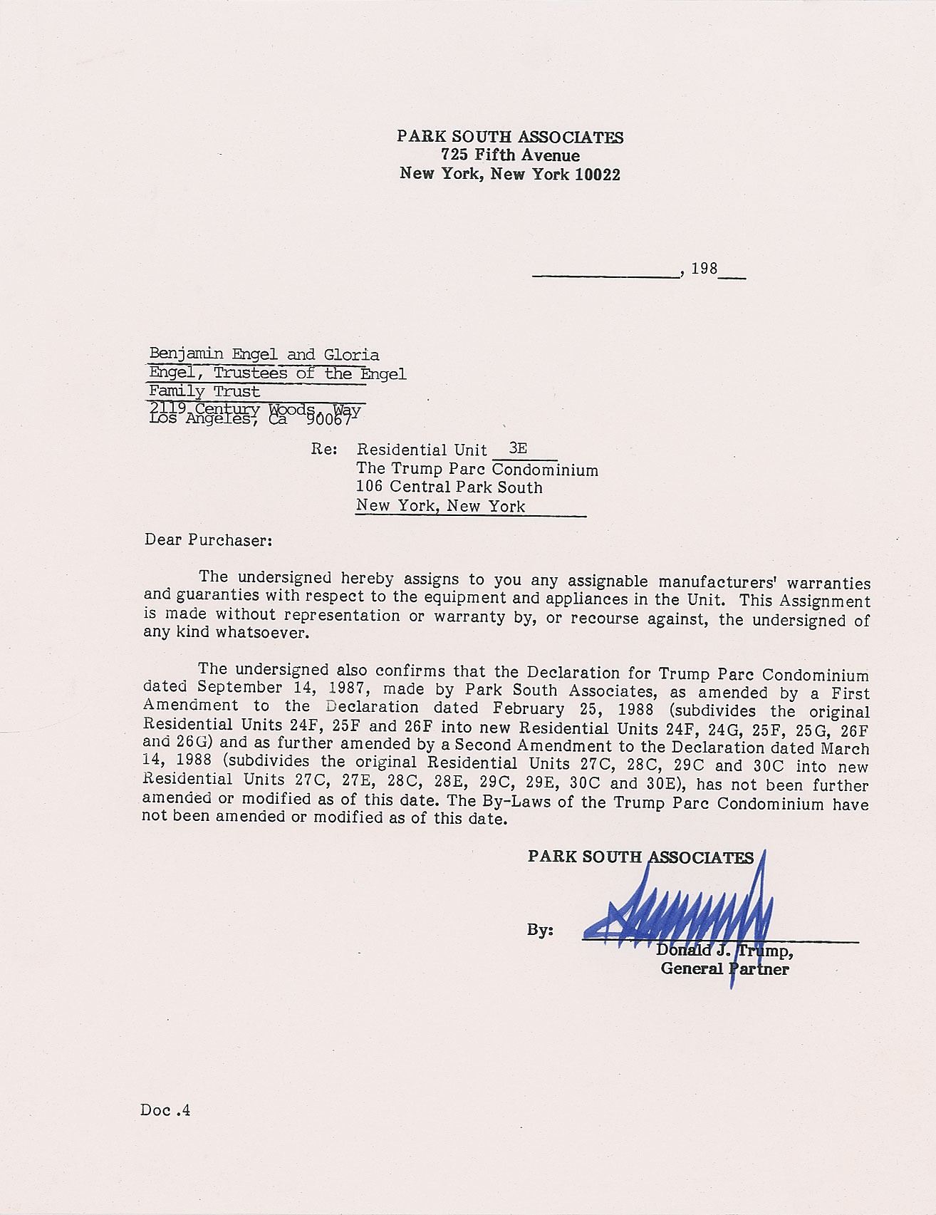DS, one page, 8.5 x 11, no date but circa late 1980s. Letter of agreement between Benjamin and Gloria Engel and Donald Trump, in which the latter assigns "any assignable manufacturers' warranties and guaranties with respect to the equipment and appliances" in residential unit 3E in the Trump Parc Condominium. Signed at the conclusion in blue felt tip by Trump. In fine condition. Accompanied by full letters of authenticity from JSA and Beckett.