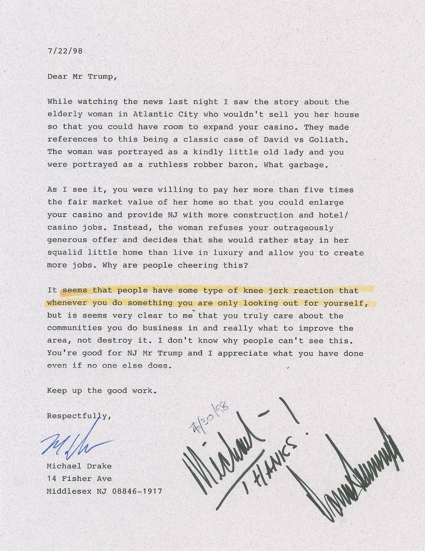 Brief handwritten note in black felt tip, "Michael—Thanks! Donald Trump," on a TLS addressed to him by Michael Drake, one page, 8.5 x 11, July 22, 1998. Drake's letter, in part: "While watching the news last night I saw the story about the elderly woman in Atlantic City who wouldn't sell you her house so that you could have room to expand your casino. They made references to this being a classic case of David vs Goliath. The woman was portrayed as a kindly little old lady and you were portrayed as a ruthless robber baron. What garbage…It seems that people have some type of knee jerk reaction that whenever you do something you are only looking out for yourself, but i[t] seems very clear to me that you truly care about the communities you do business in." Ballpoint notation indicates that Trump signed the letter on July 30, 1998. In fine condition.