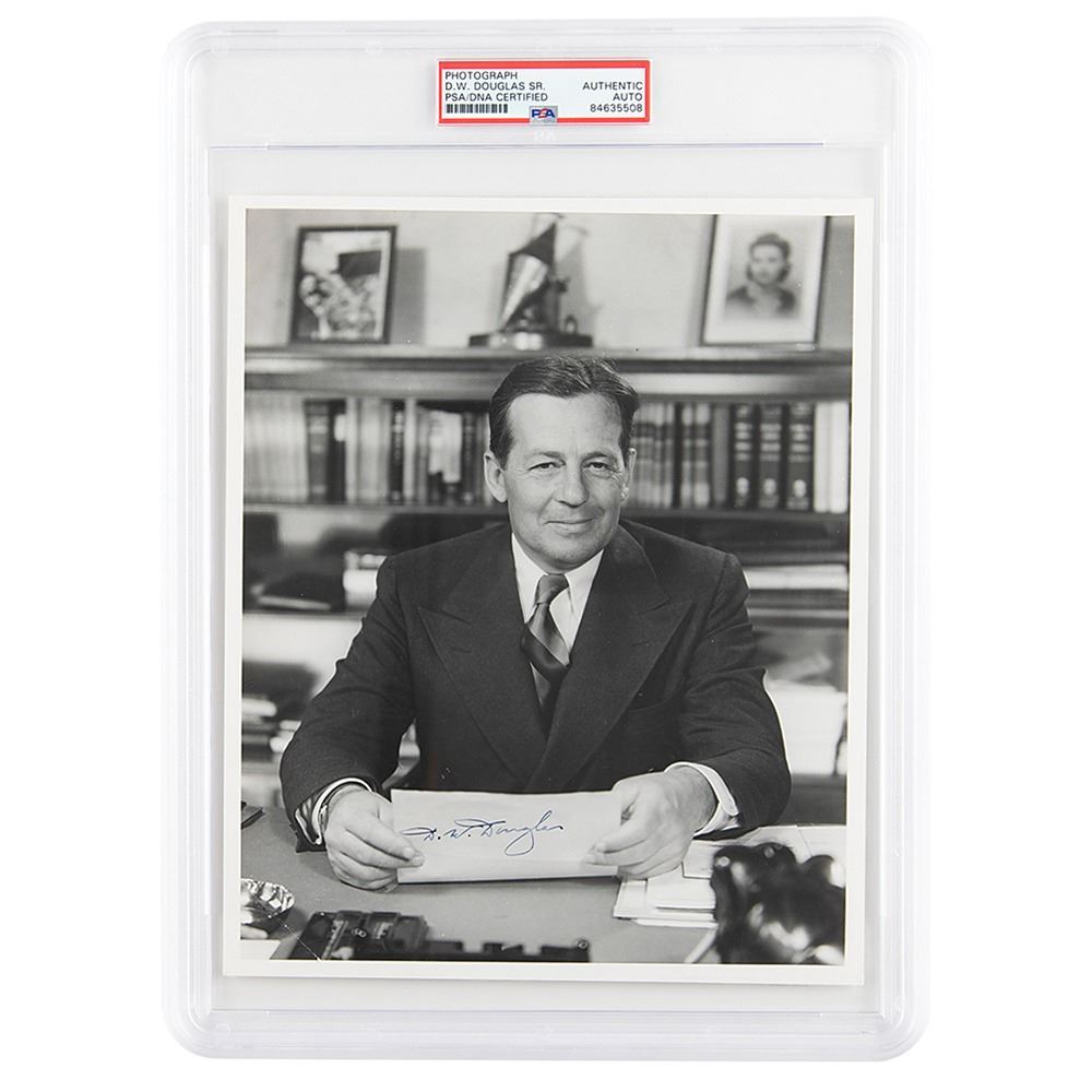 Scarce vintage glossy 8.25 x 10 photo of Donald Wills Douglas seated at his desk, signed in fountain pen, "D. W. Douglas." In fine condition, with scattered light creasing. Encapsulated in a PSA/DNA authentication holder.