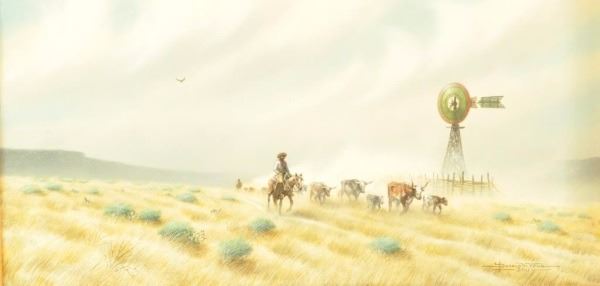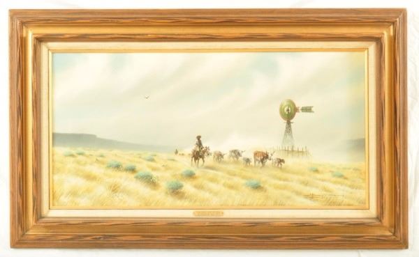 "Cow Trails, Dust & Wing". Canvas: 15" x 30", Frame: 22-1/2" x 37-1/2".