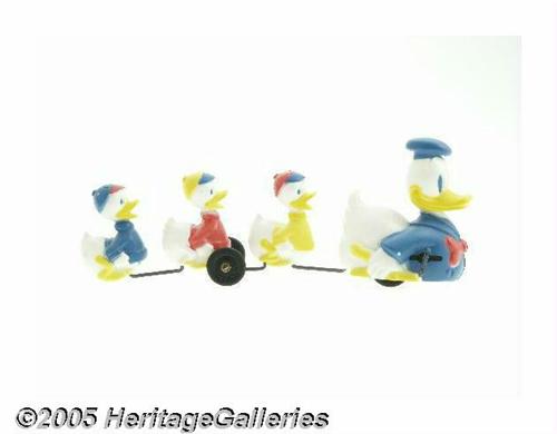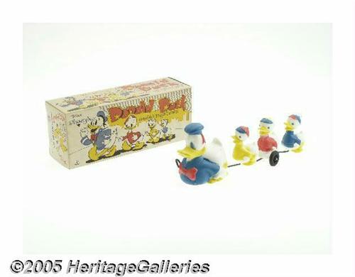 <B>Donald and His Nephews Wind-Up Toy with Box (Marx, 1949).</B></I> One of a series of windup toys made by Louis Marx and Company, this 1949 Donald and His Nephews is one of the most desirable. Due in large part of Carl Barks' comic book use of Huey, Dewey and Louie, the Nephews enjoy a large and devoted following. Offered here is one of the earliest Disney collectibles featuring the trio -- and their beloved Uncle Donald. Both the toy and the attractive box appear to be unused - about as close to Mint as you'll ever see. The easily-damaged plastic Ducks look just as they did under Christmas trees over 55 years ago. A wonderful collectible for the collector looking for the very best! <I>From the Larry Jacobs Collection.</B></I>