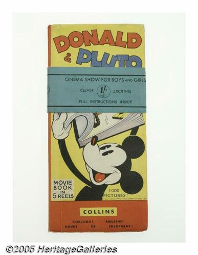 <B>Donald and Pluto Flip Reels Book with Paper Label - British (Collins, 1939).</B></I> One of the highlights of the Larry Jacobs Collection is the carefully selected inclusion of a handful of non-U.S. Disney books. This beautiful 1939 English publication (Collins Publishing) is basically a large flip-book -- featuring five separated "flip sections" and 1,000 separate Disney images! Best of all, the original advertising banner remains intact and present on book. Volume shows very light edge/corner wear and just a hint of dusting. Exceptionally sharp cover image. Overall Very Fine to Near Mint condition. <I>From the Larry Jacobs Collection.</B></I>