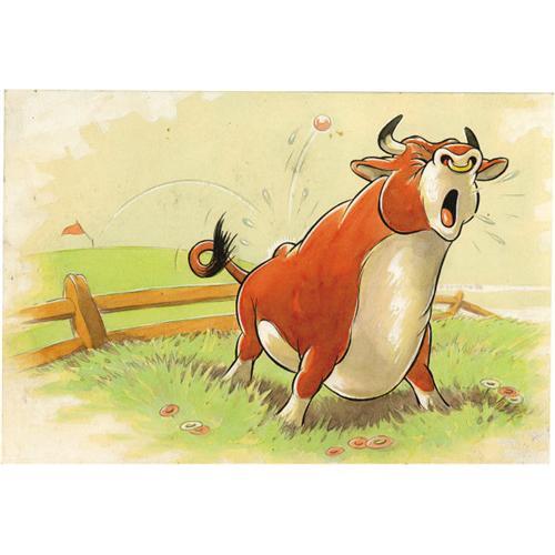 <B>"Donald's Golf Game" Animation Production Drawing Original Art (Walt Disney, 1938).</B></I> An errant golf ball "tees" off a bull, in this splendid colored production sketch by the artists of the Walt Disney Studios. Rendered in ink, watercolor, and pencil on a 8" x 5.25" sheet of paper. Some light aging; otherwise in Very Good condition.