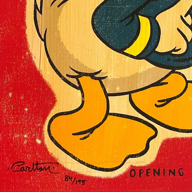 "Donald's Opening Number" is a limited edition giclee on canvas by Trevor Carlton, numbered 84/195 and hand signed by the artist. This piece is licensed by Disney Fine Art and comes gallery wrapped. Includes Letter of Authenticity. Measures approx. 24" x 18" (image). There is a very faint horizontal mark above Donald's thigh that appears to be an artifact of the printing process.