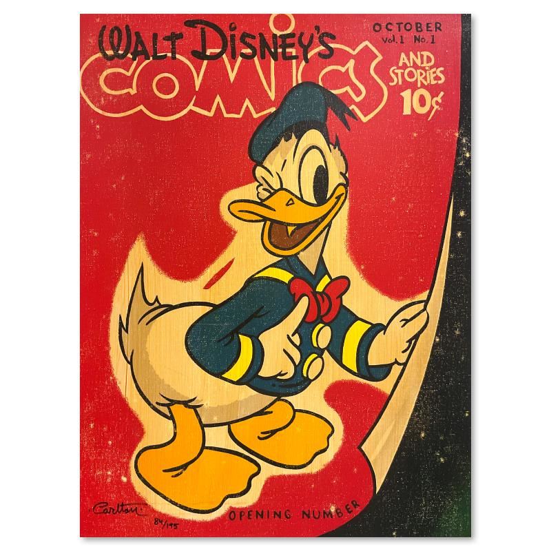 "Donald's Opening Number" is a limited edition giclee on canvas by Trevor Carlton, numbered 84/195 and hand signed by the artist. This piece is licensed by Disney Fine Art and comes gallery wrapped. Includes Letter of Authenticity. Measures approx. 24" x 18" (image). There is a very faint horizontal mark above Donald's thigh that appears to be an artifact of the printing process.